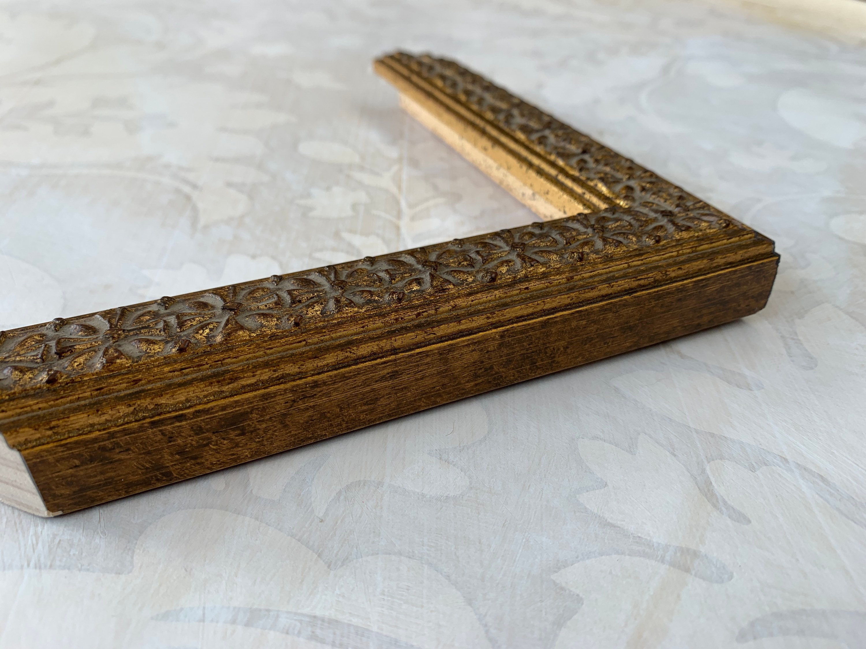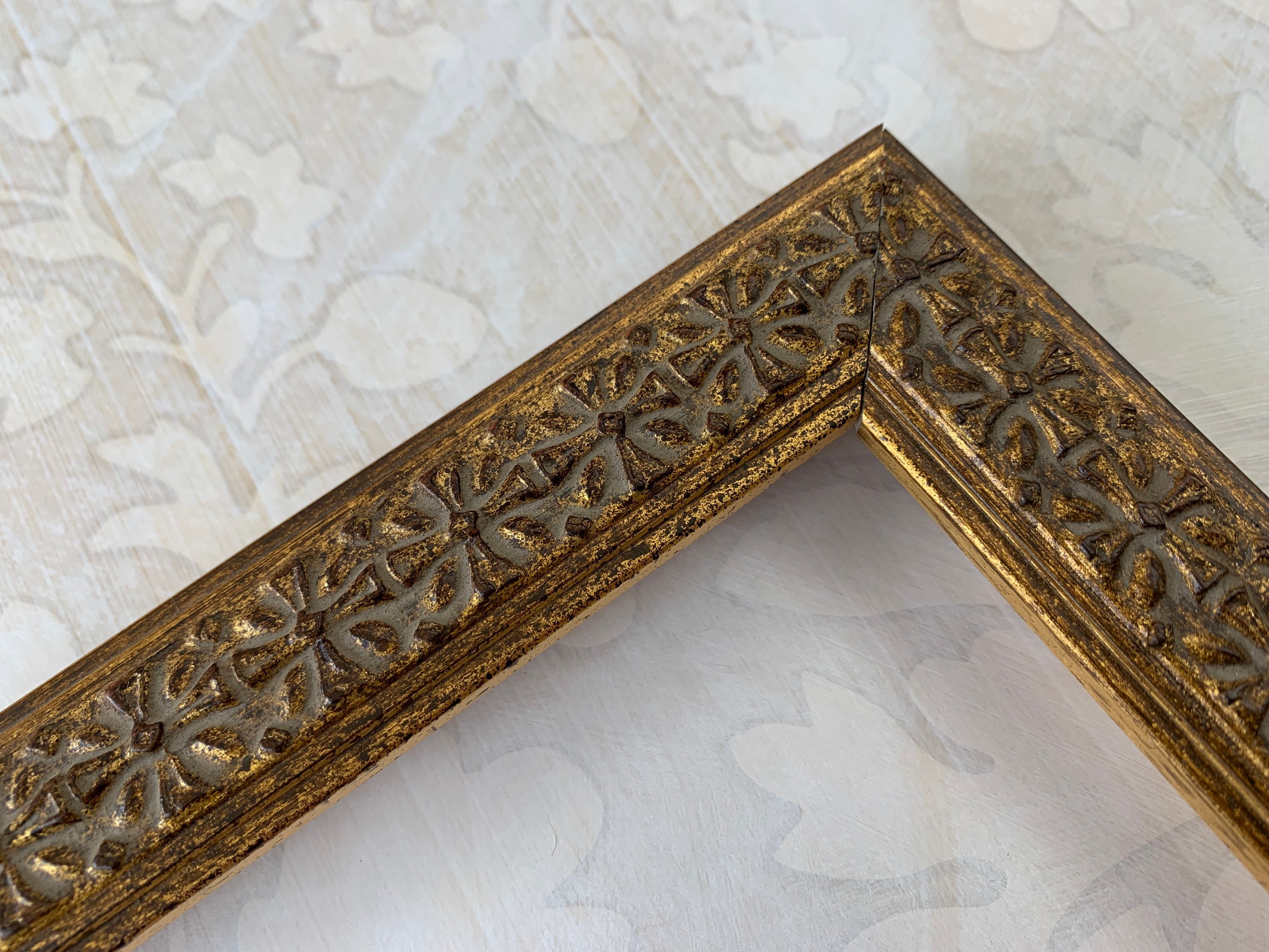 The frame is wood with an antique gold finish and carved Celtic cross design border.