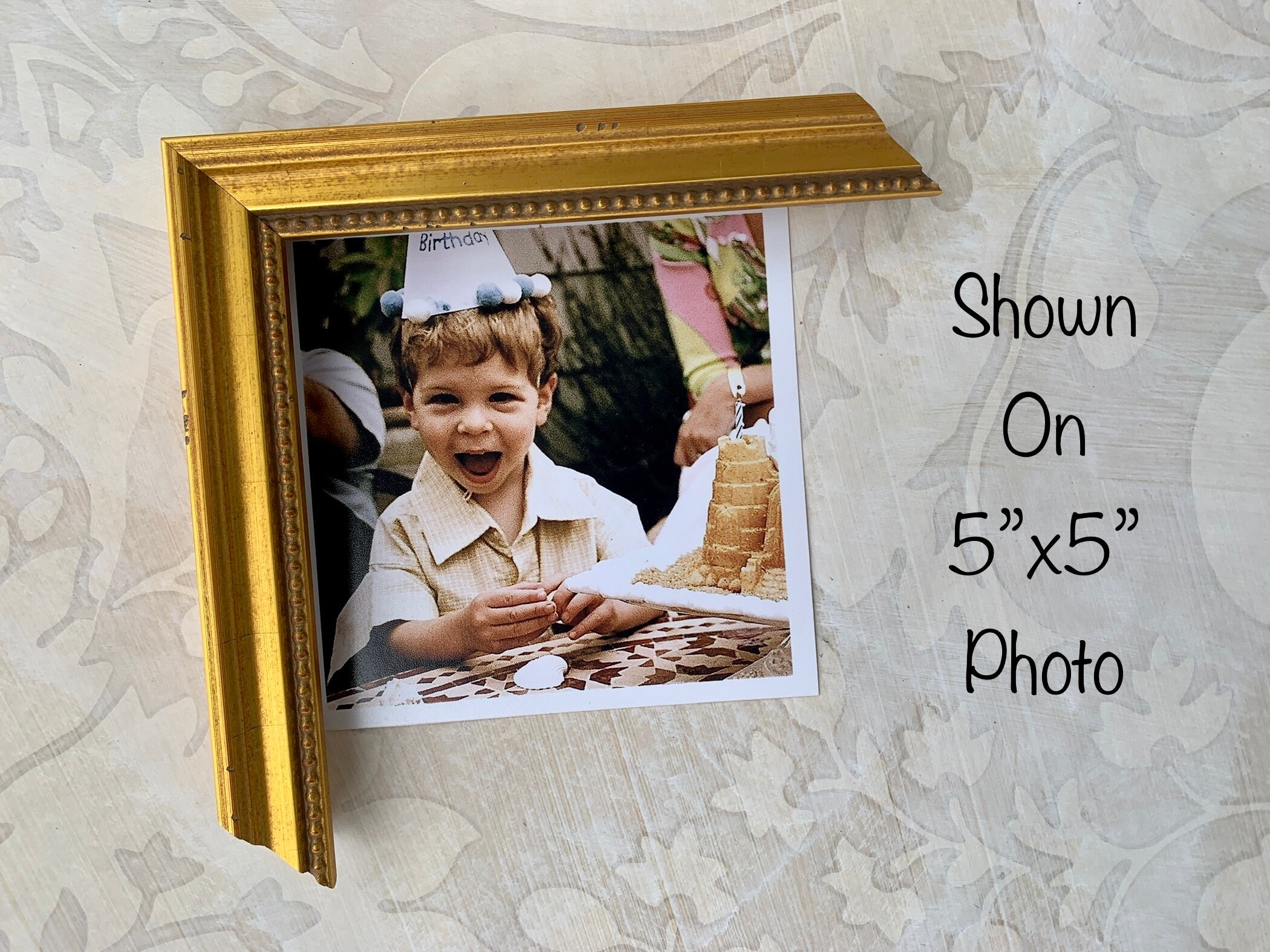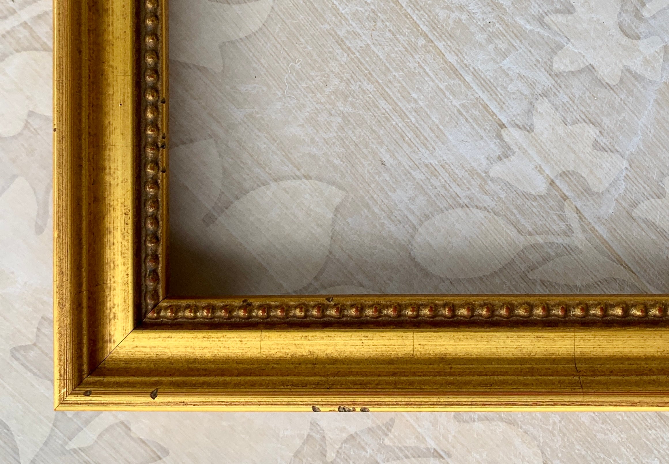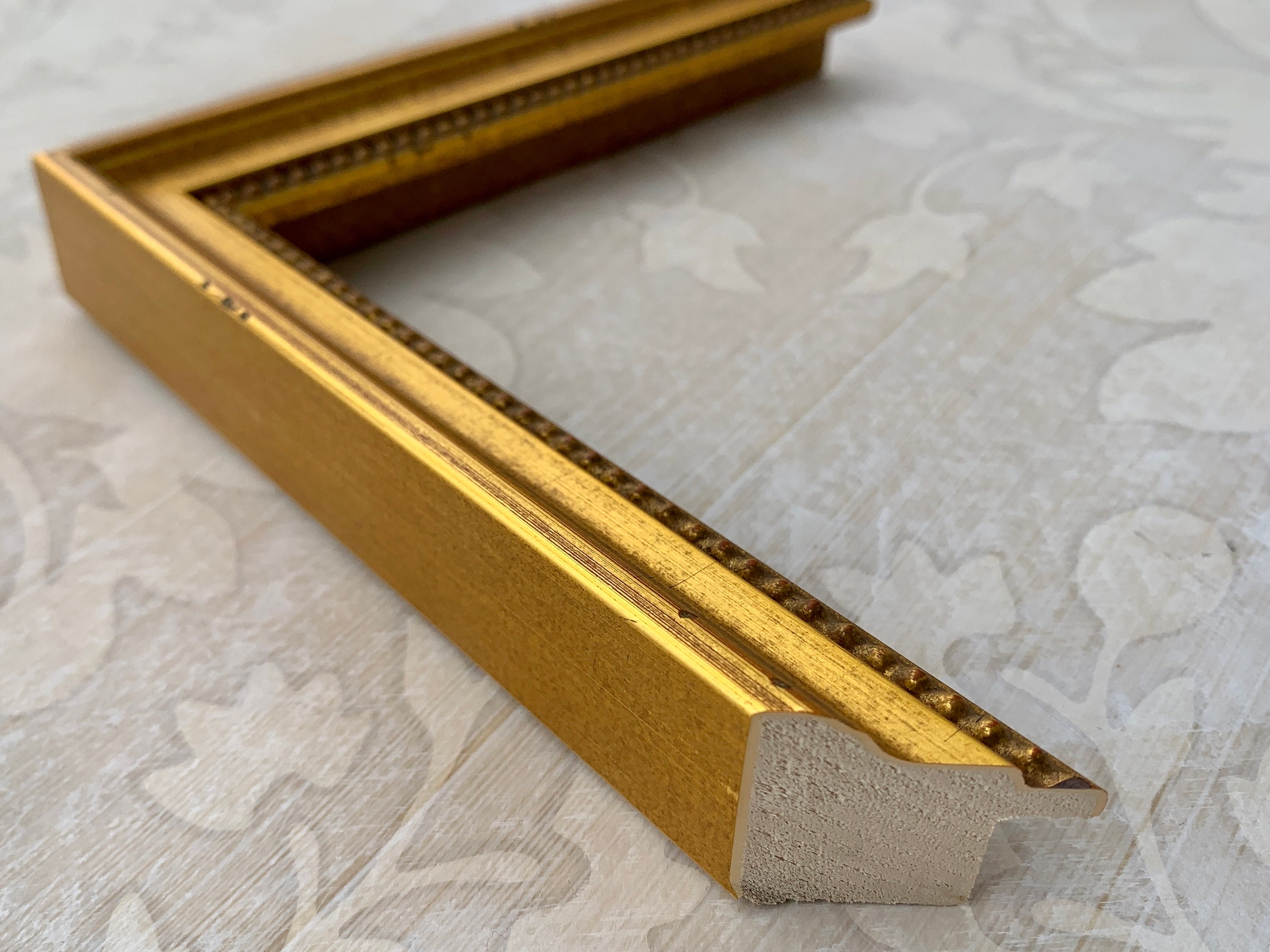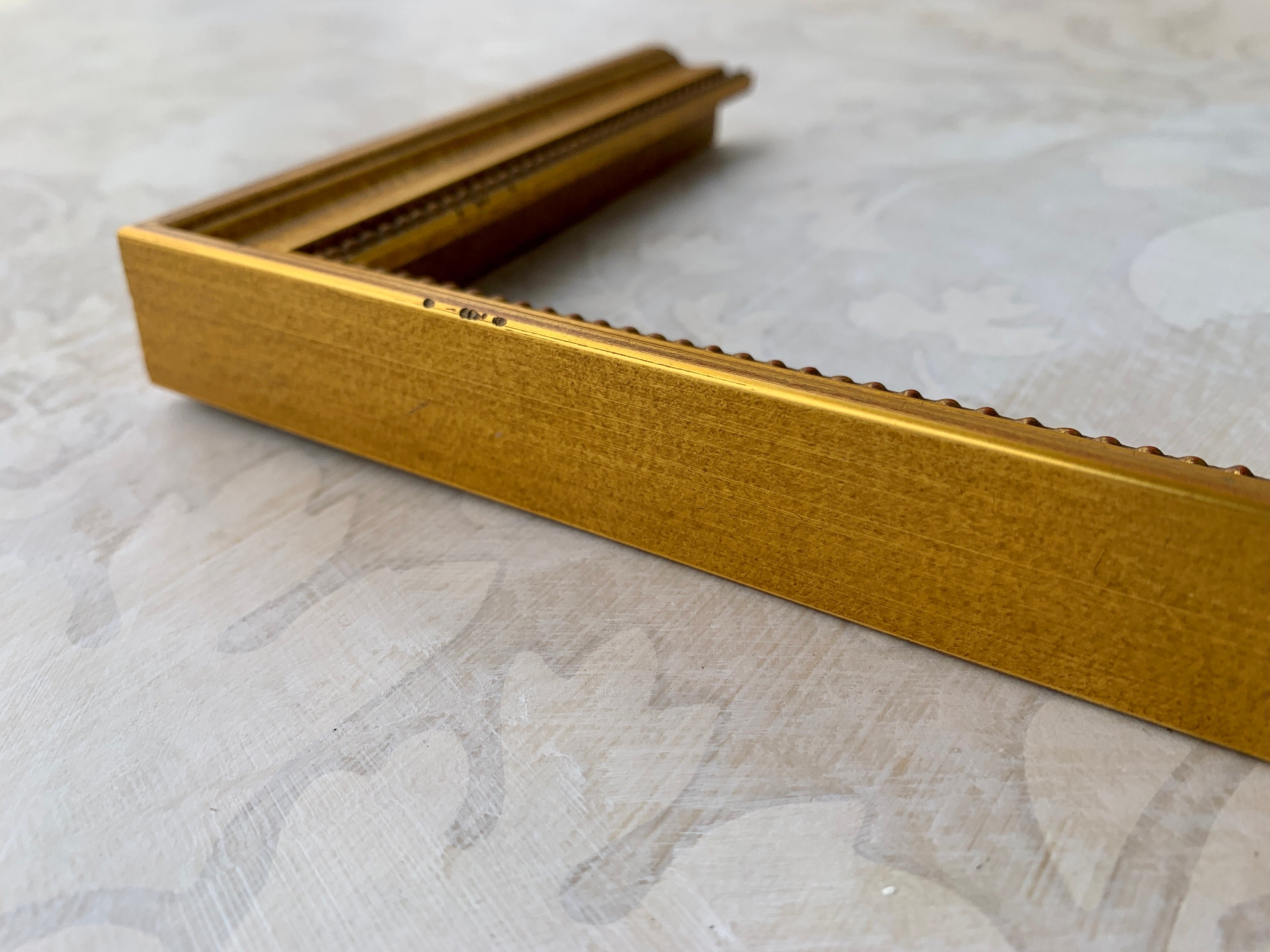 This vintage gold frame has is a traditional style with some slight distressing and an aged inner bead.