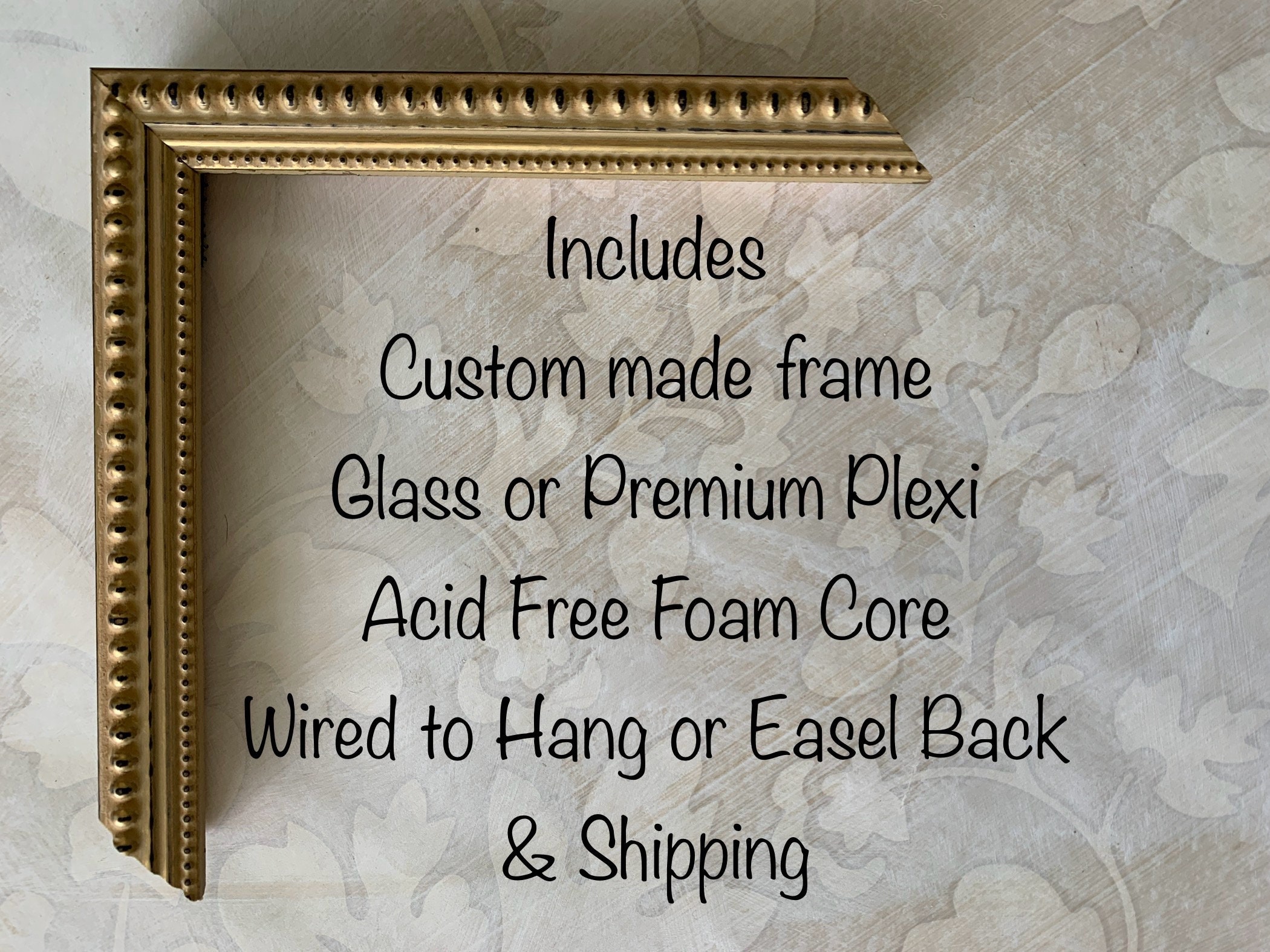 Be sure to let us know if we're framing a painting on stretcher bars or a canvas board and we'll include the appropriate clips to hold your artwork into the frame and will not include glass unless you request it.