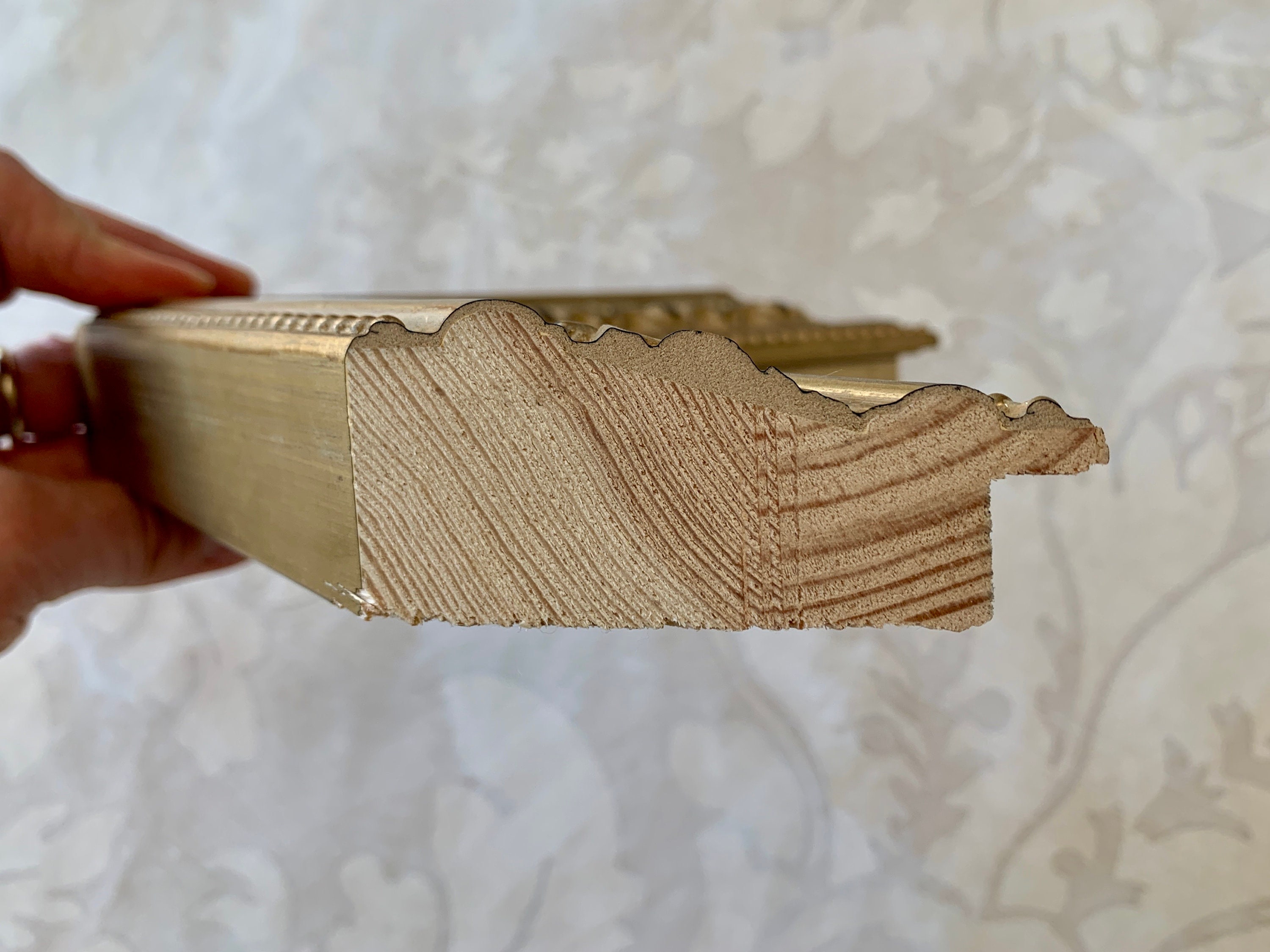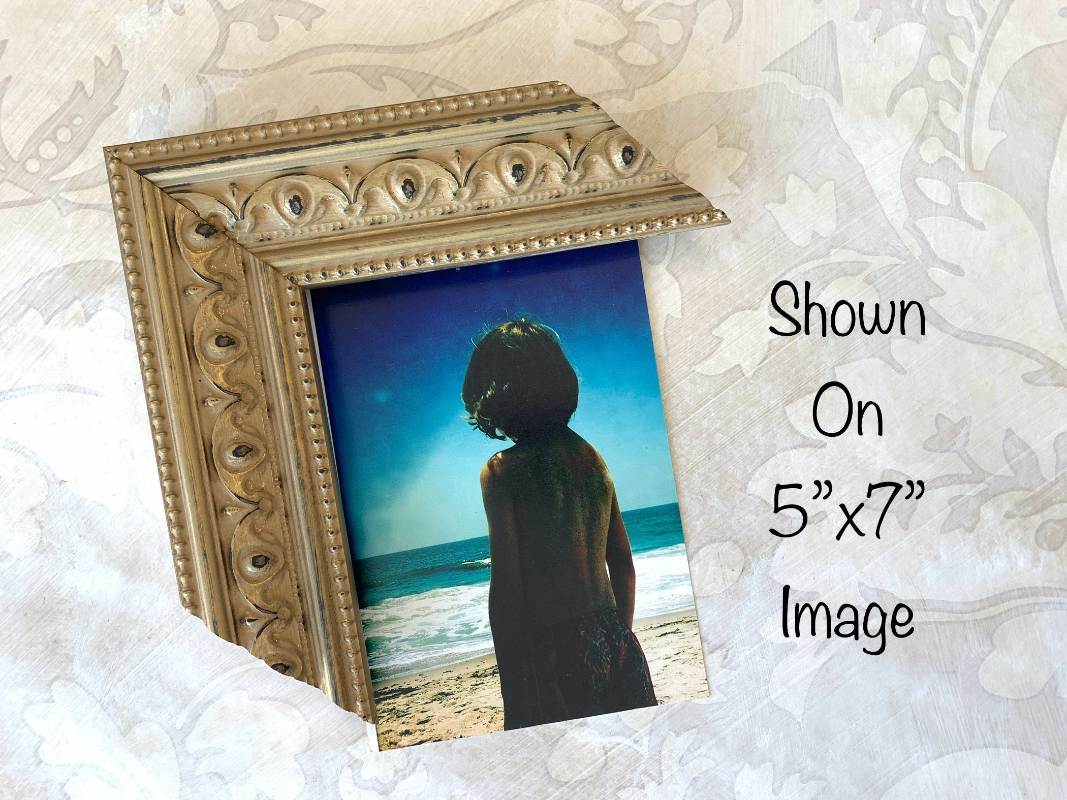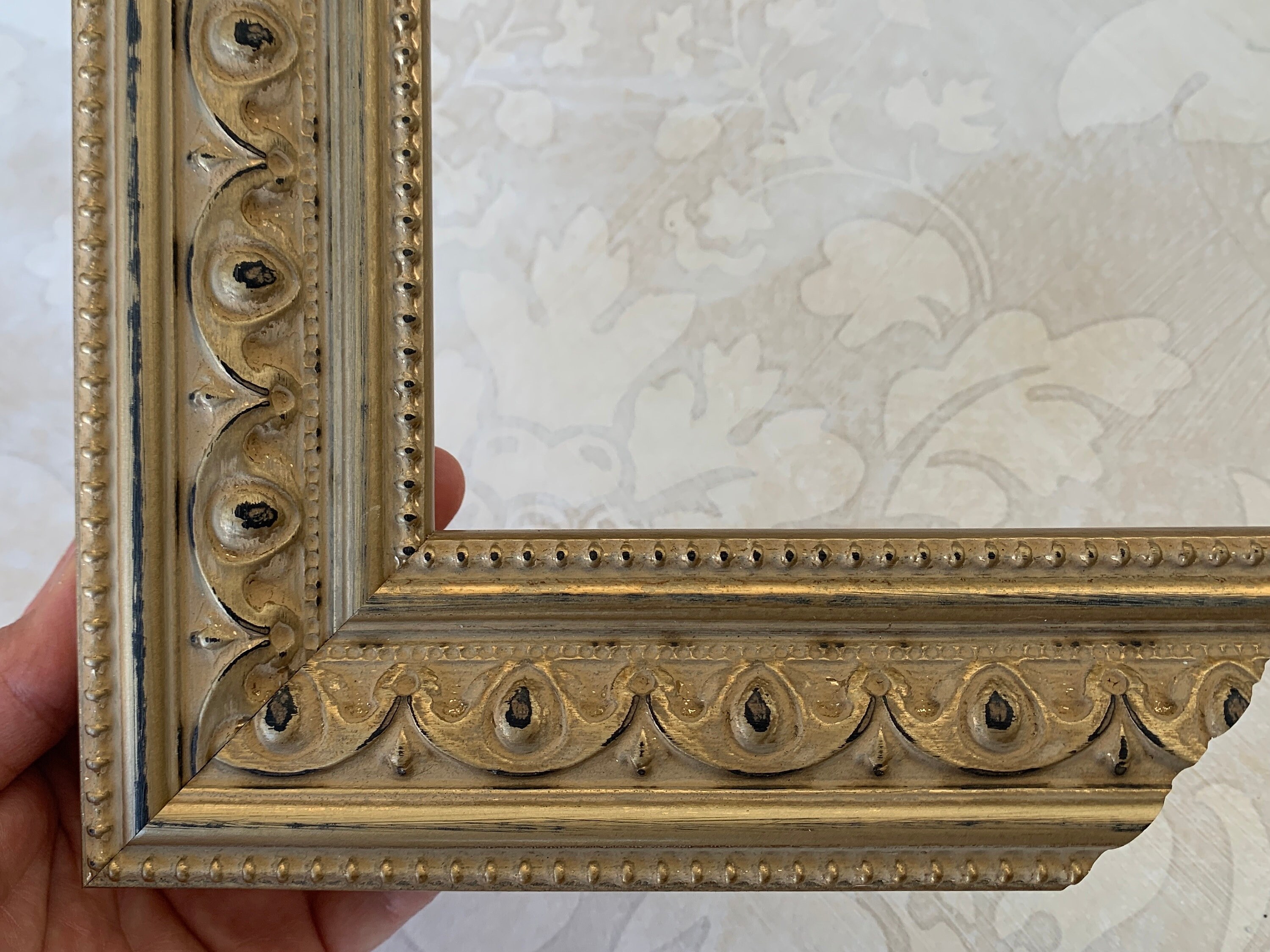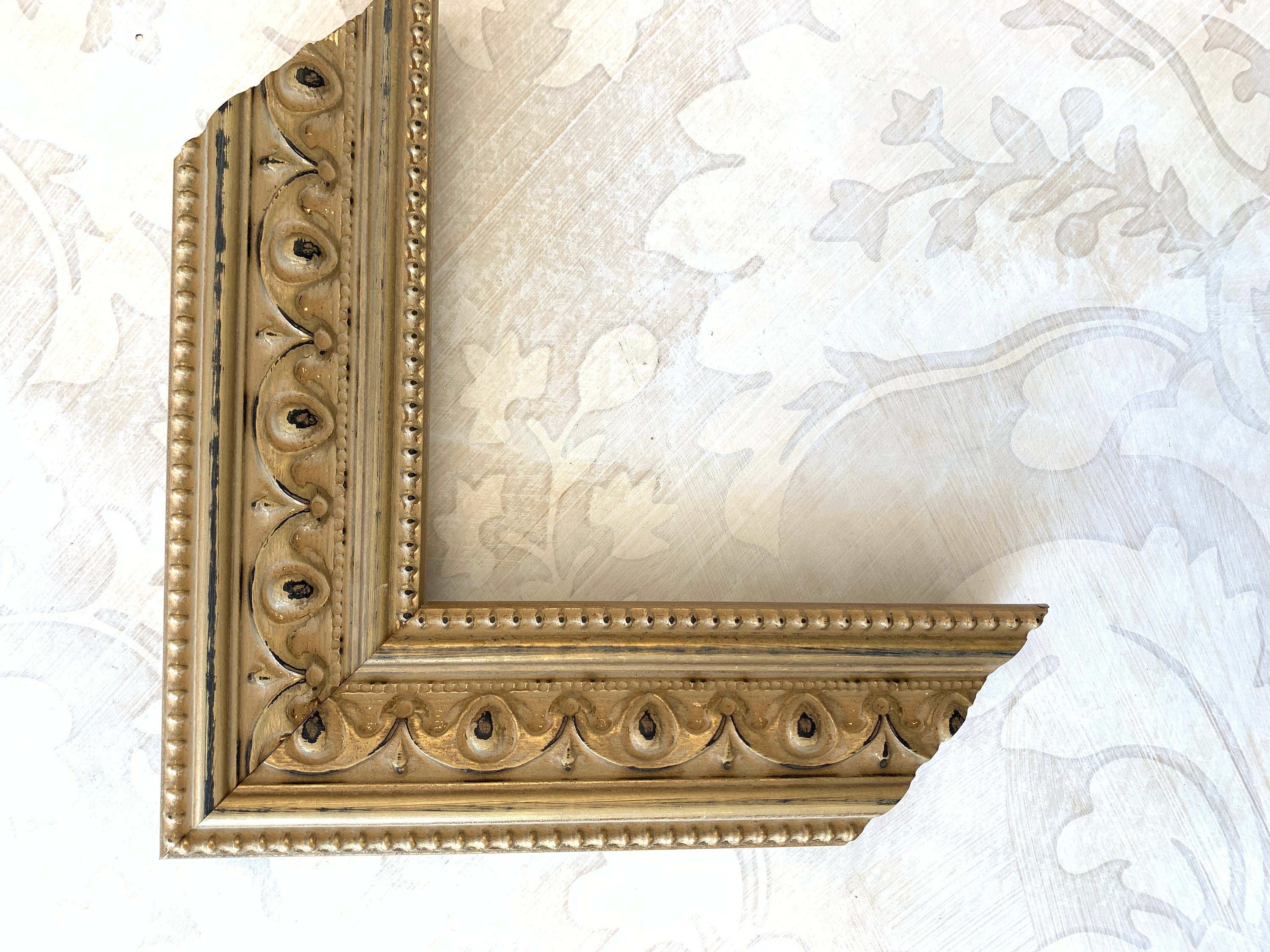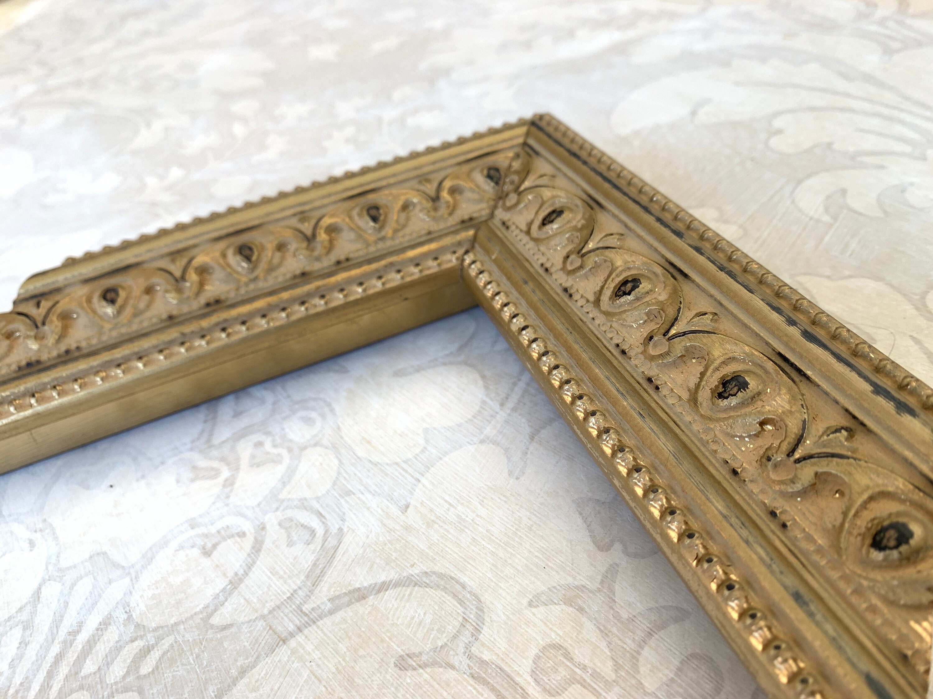 The frame is constructed of wood with a detailed compo overlay with a vintage pale matte gold finish. A traditional vintage design with a beaded inner lip