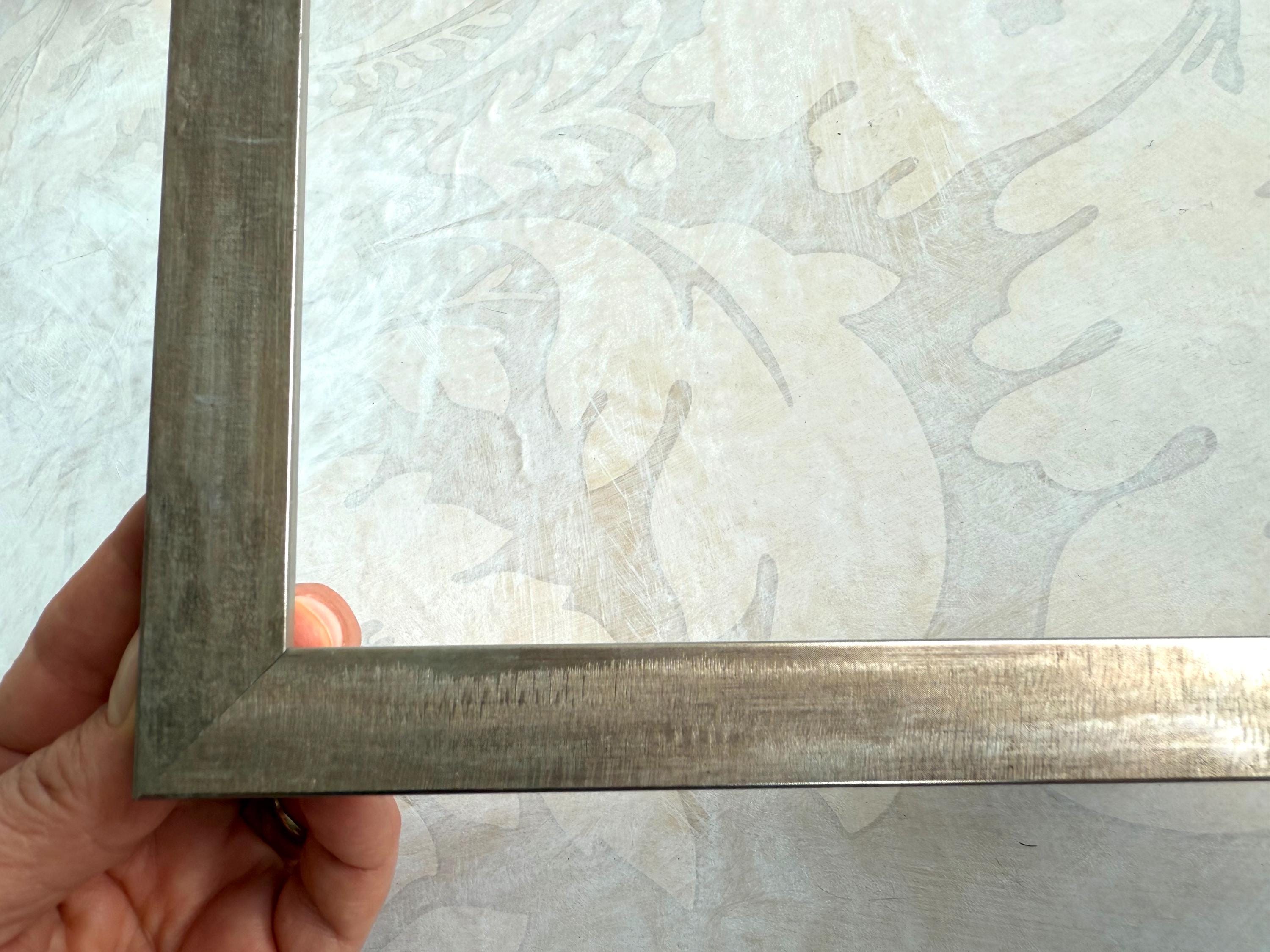 This frame has a beautiful etched metallic champagne silver finish over solid wood.