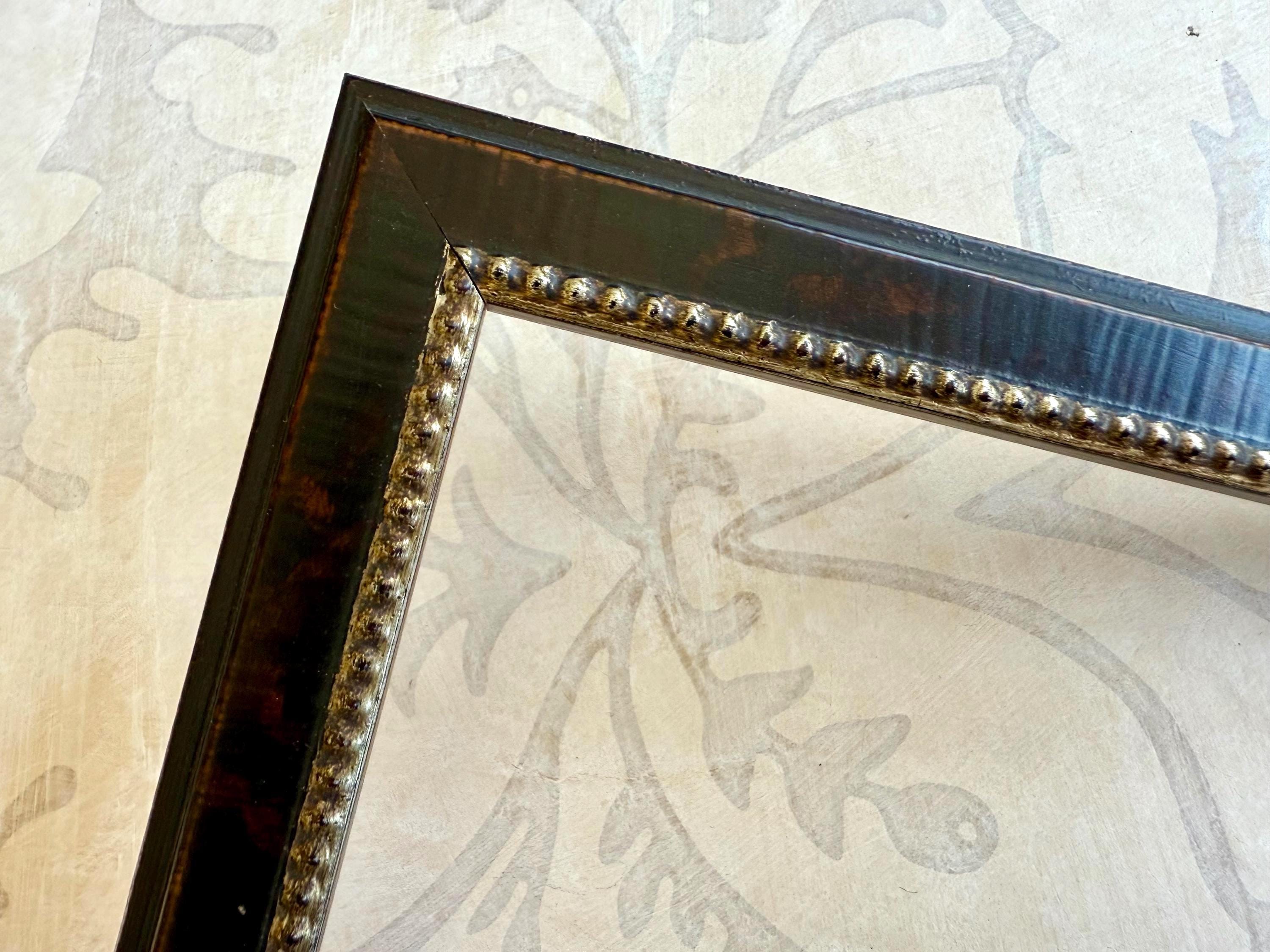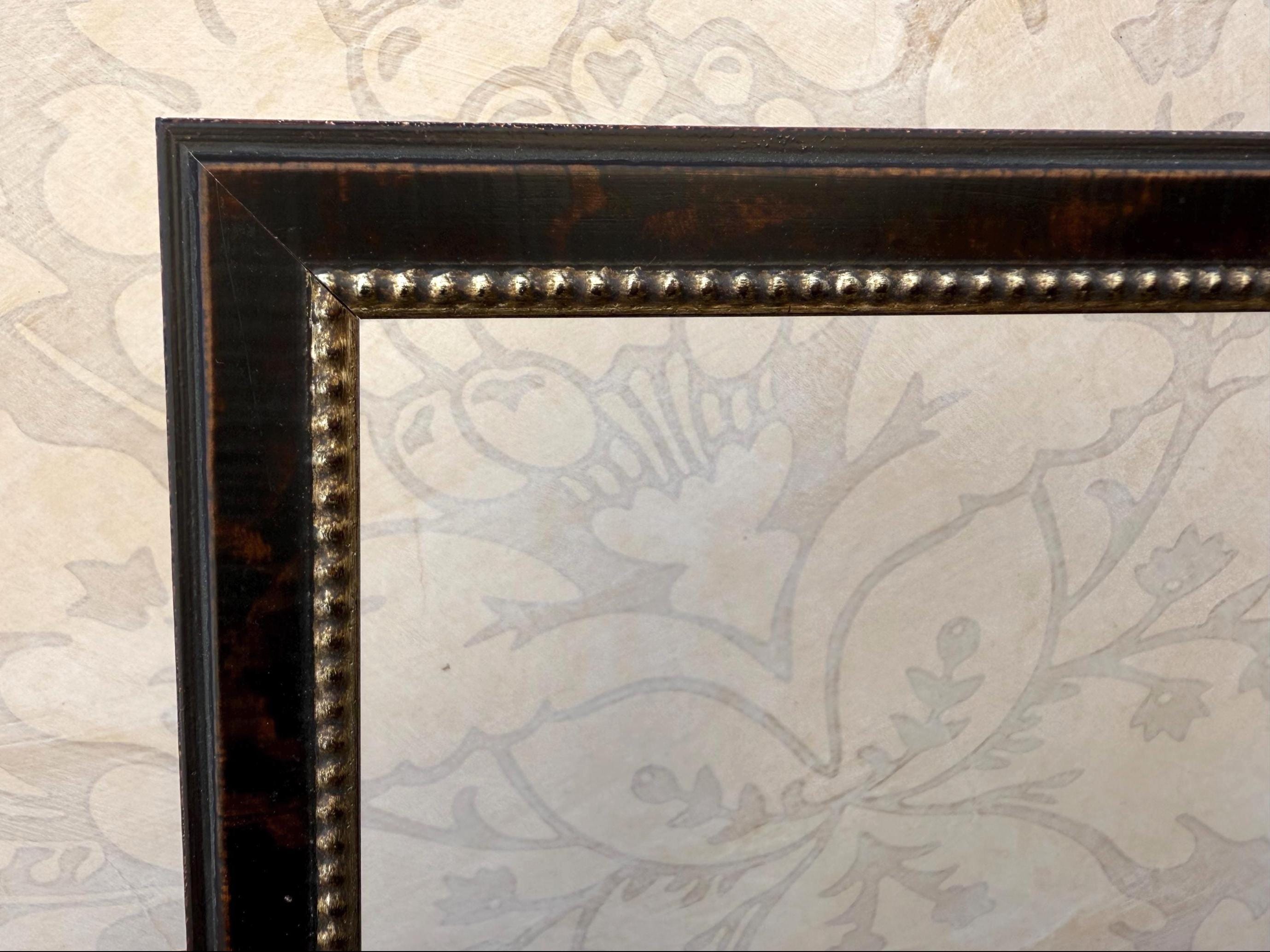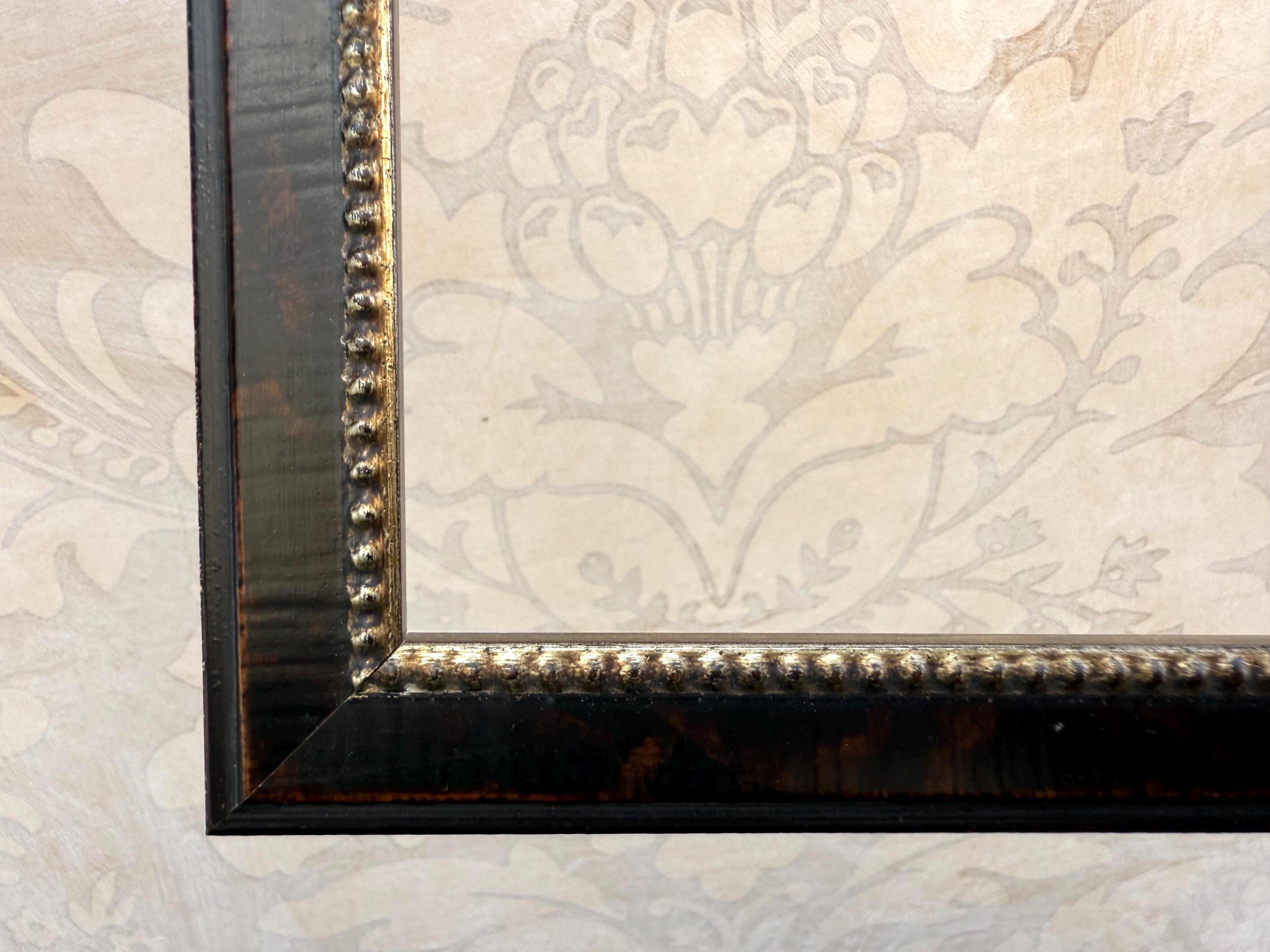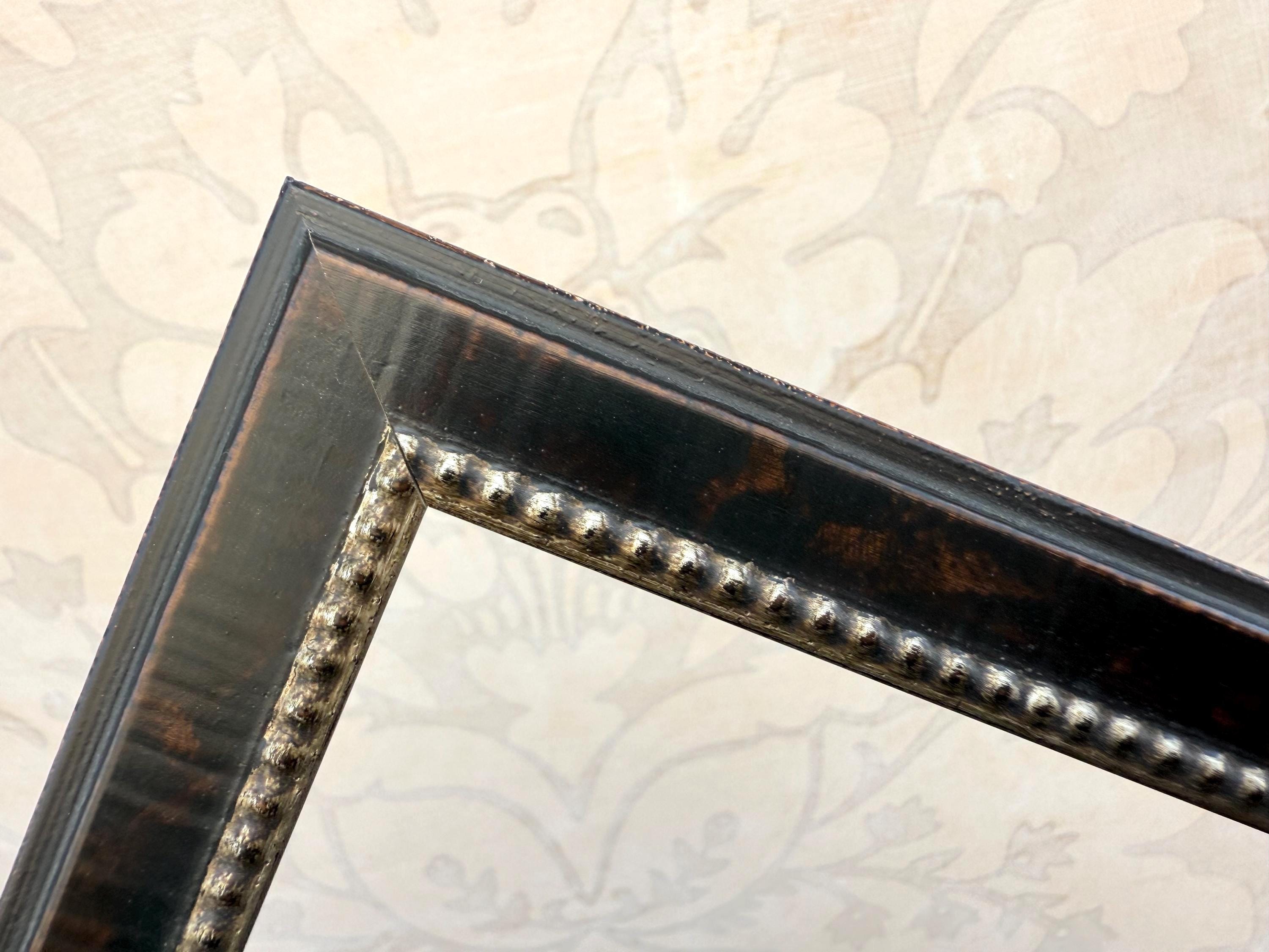 The picture frame itself is a distressed burnished solid dark burl wood with a warm silver beaded accent.