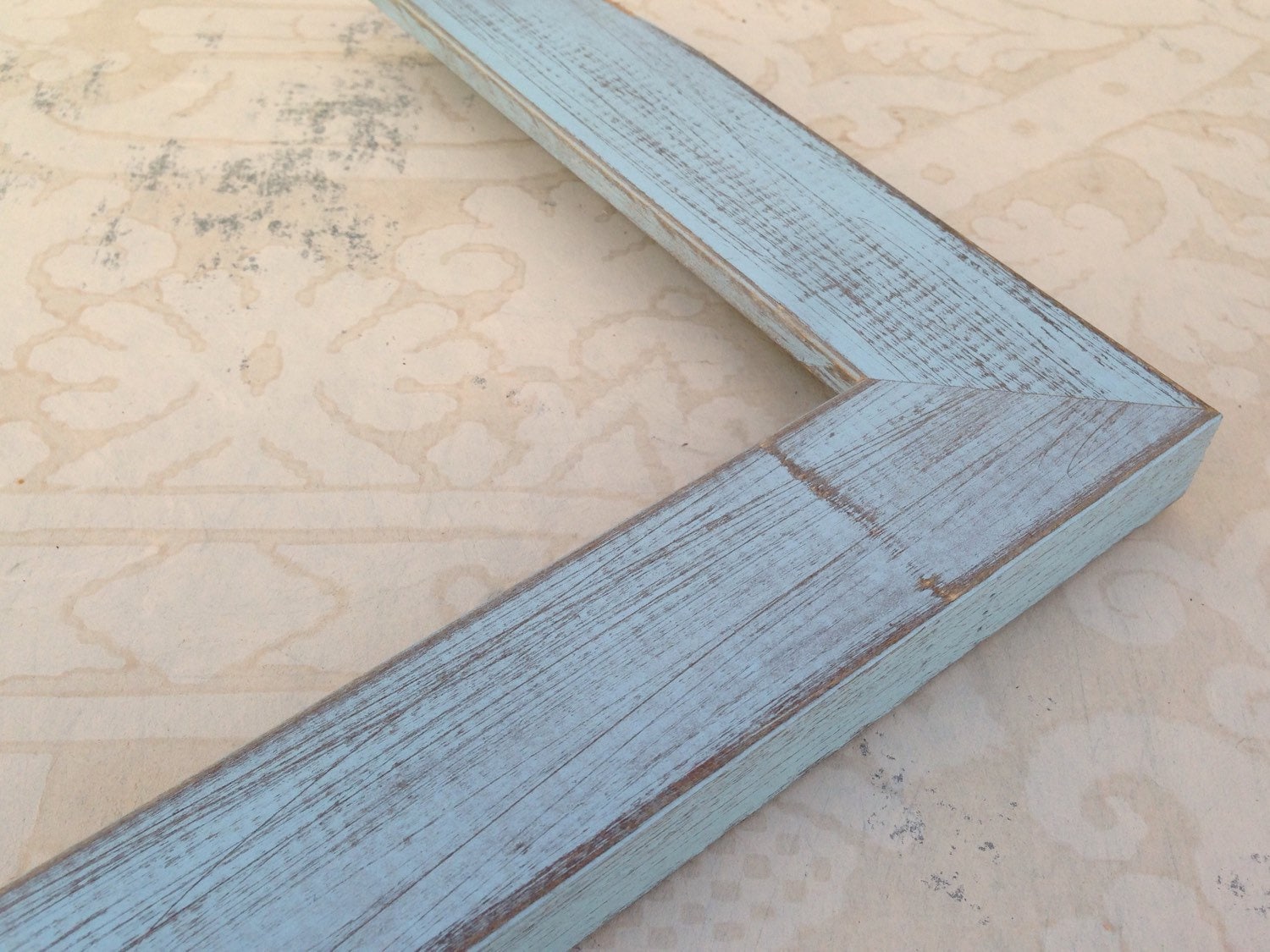 This is a beautiful quality solid wood picture frame with a distressed country cottage blue grey wash.