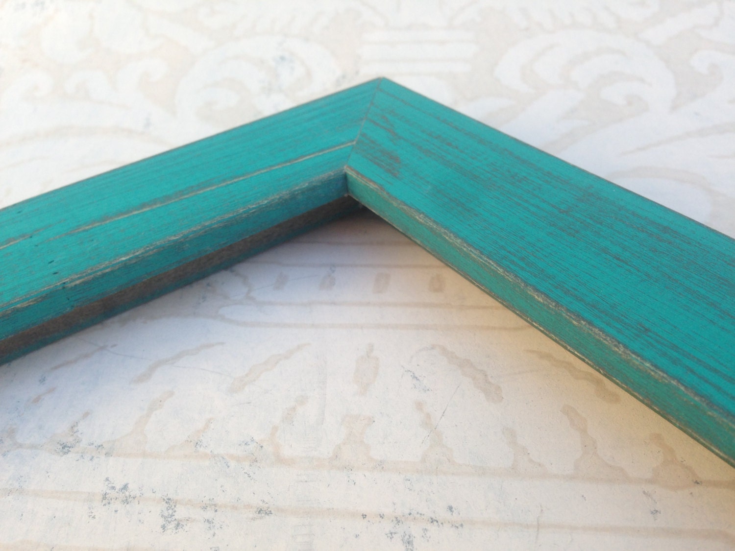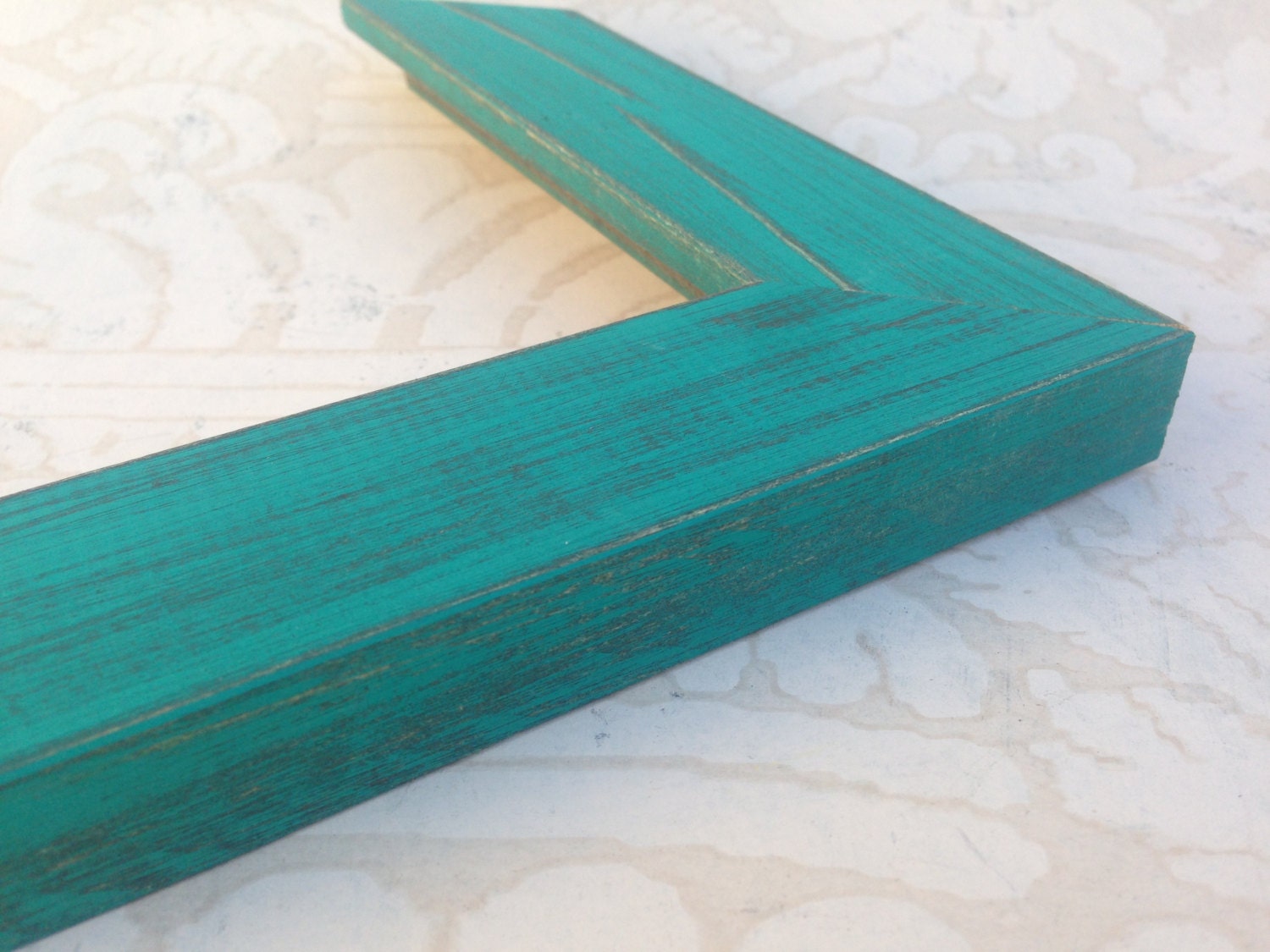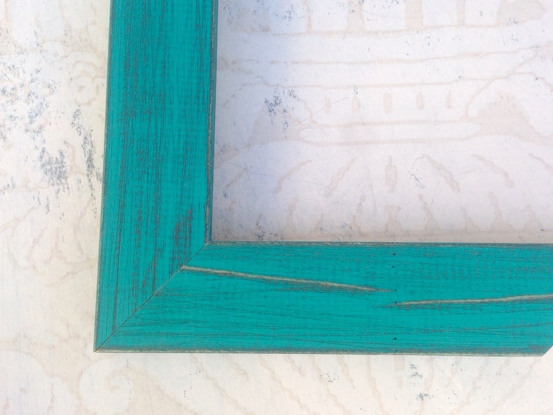 Solid reclaimed wood picture frame with a distressed vibrant turquoise blue-green wash