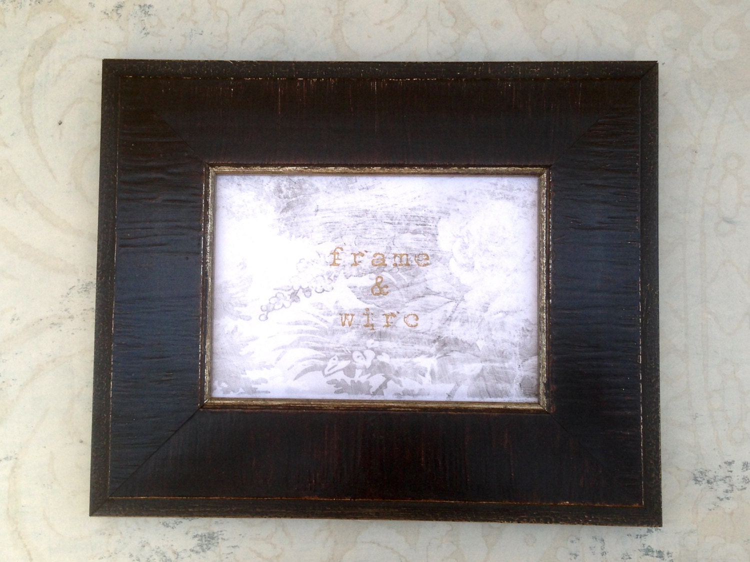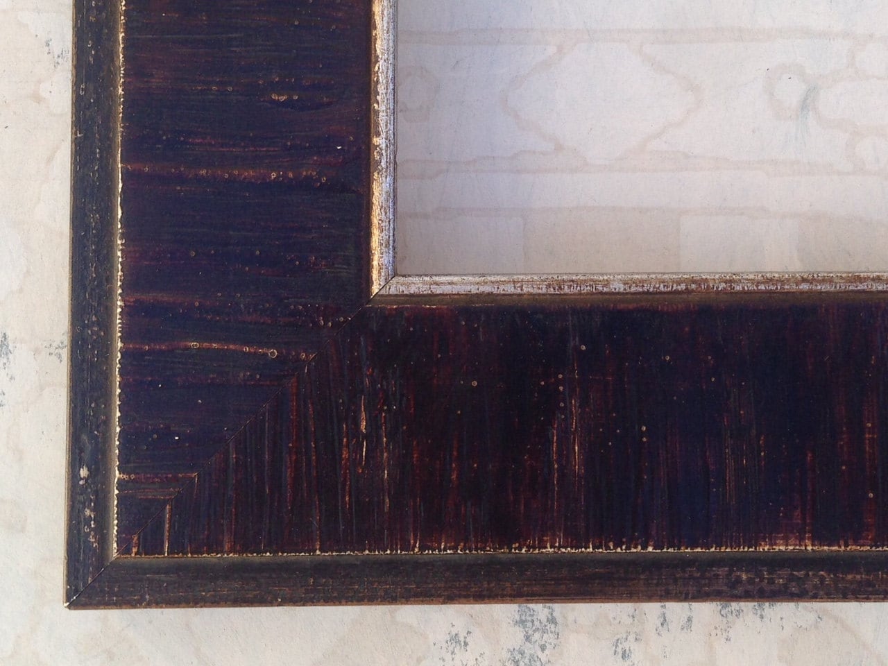 This gorgeous distressed dark wood picture frame measures 2 1/4" across the face and 3/4" deep. It has an aged silver filet/lip