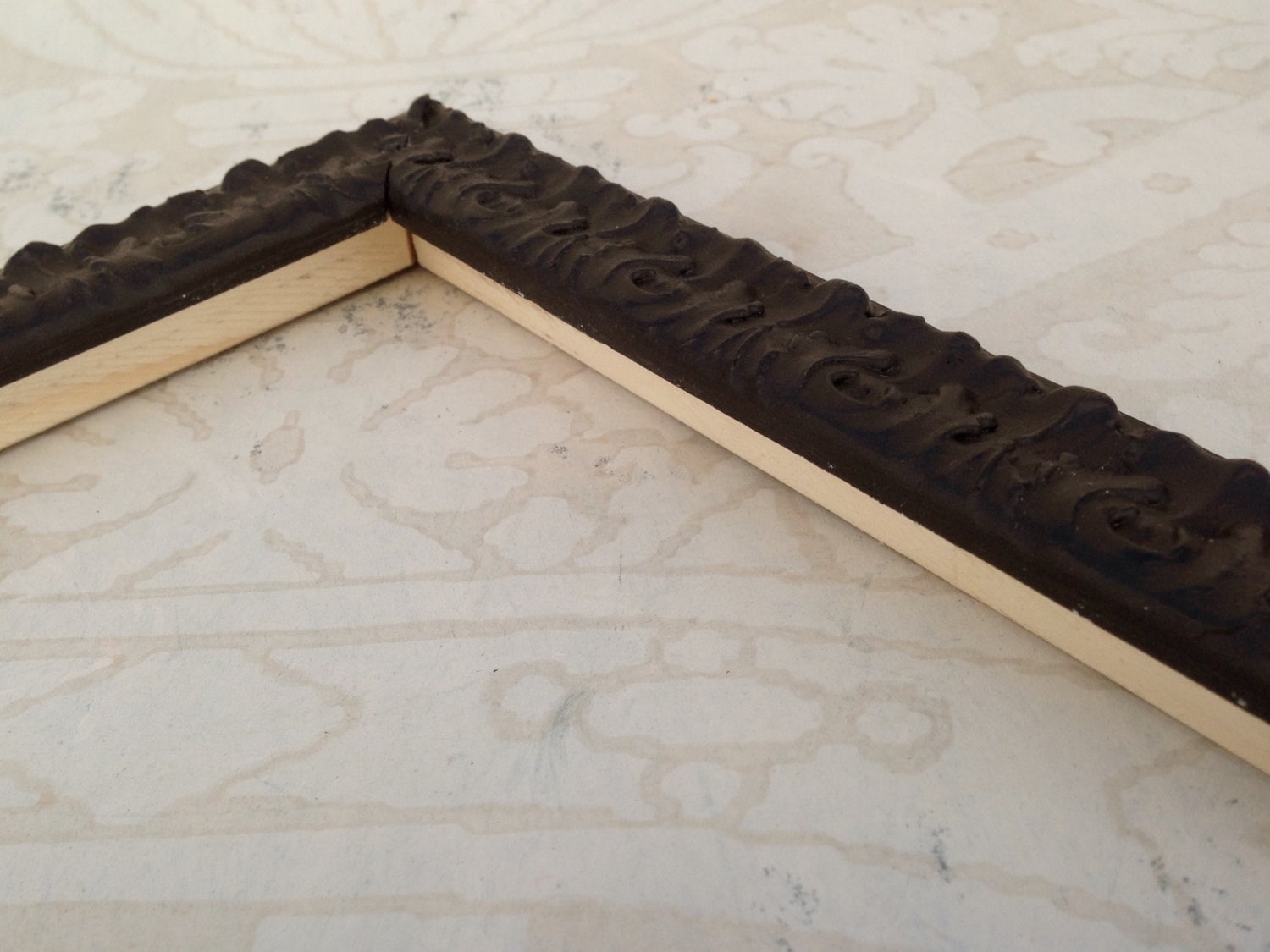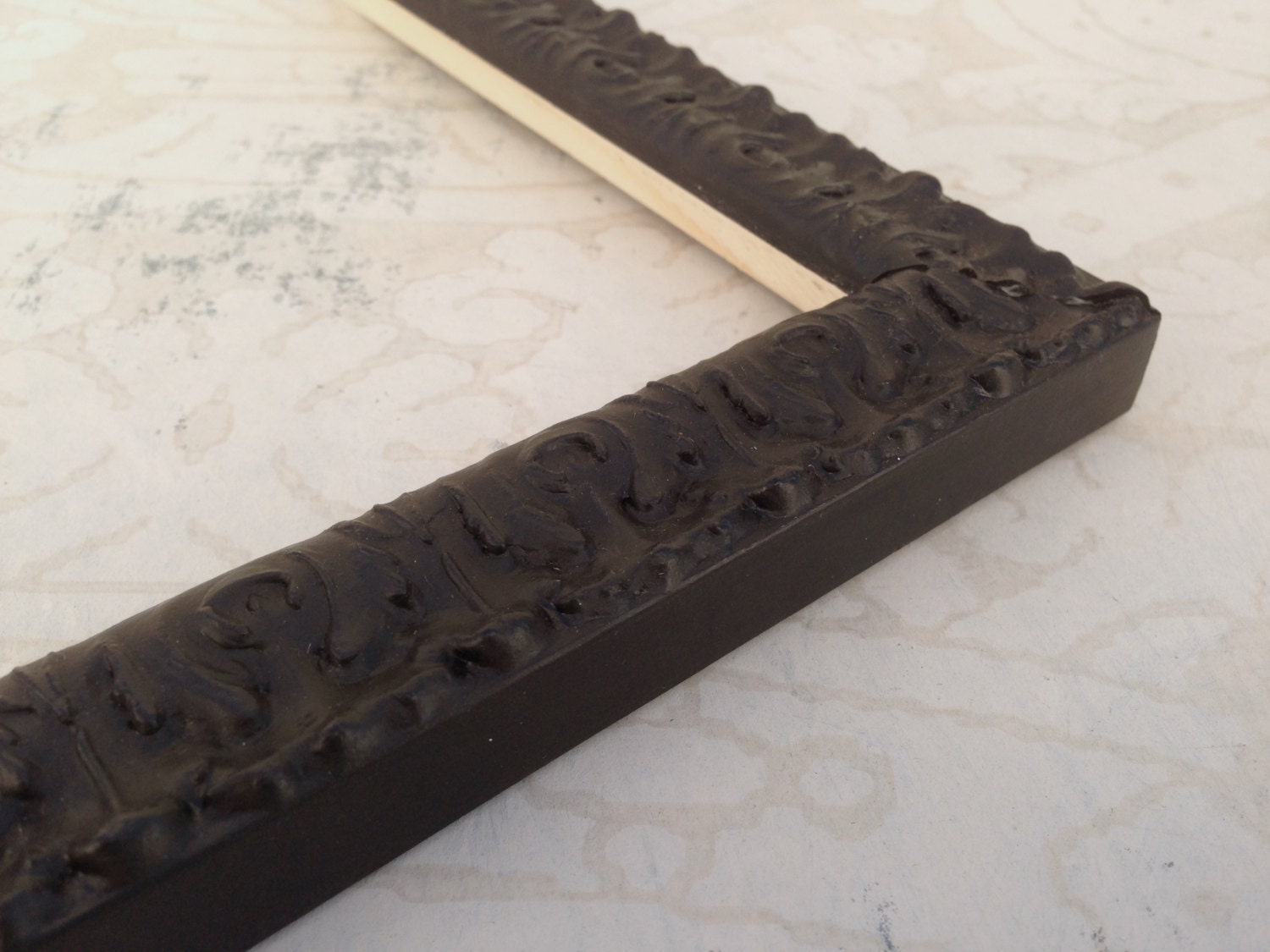 The matte black wash is over a solid carved wood frame.