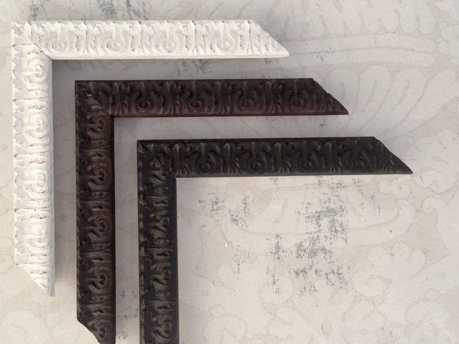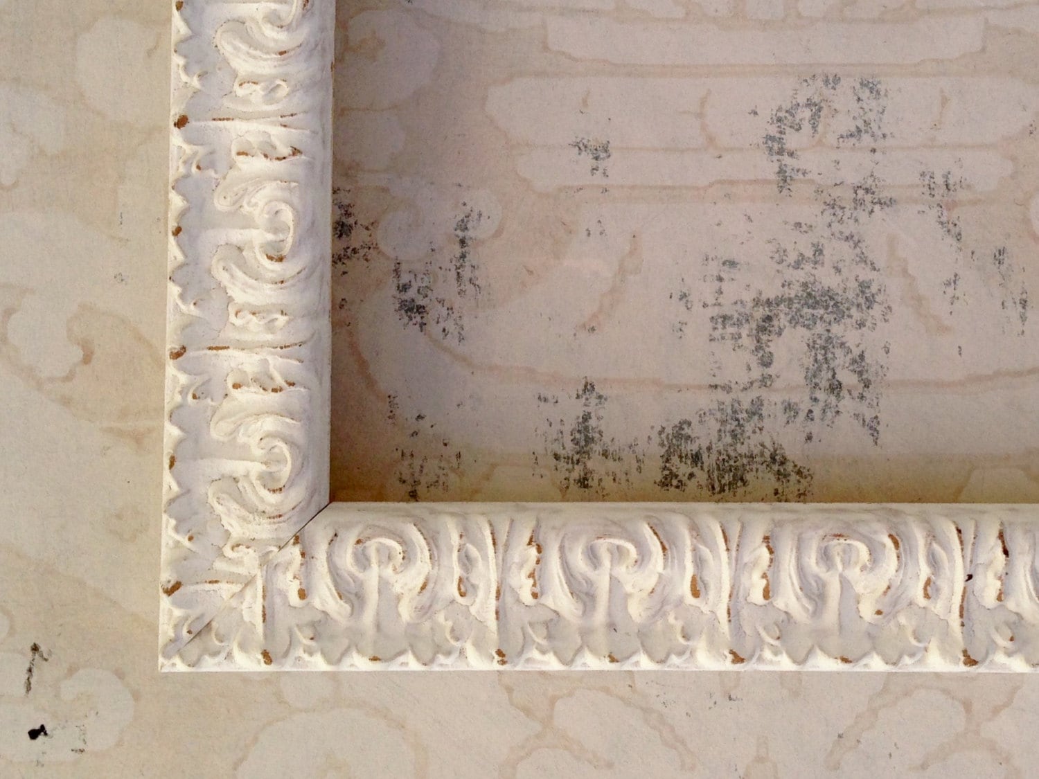 This is an ornately carved solid wood frame with a flat white finish. The finish has been rubbed away in places to reveal the wood underneath giving it a authentic vintage feel.
