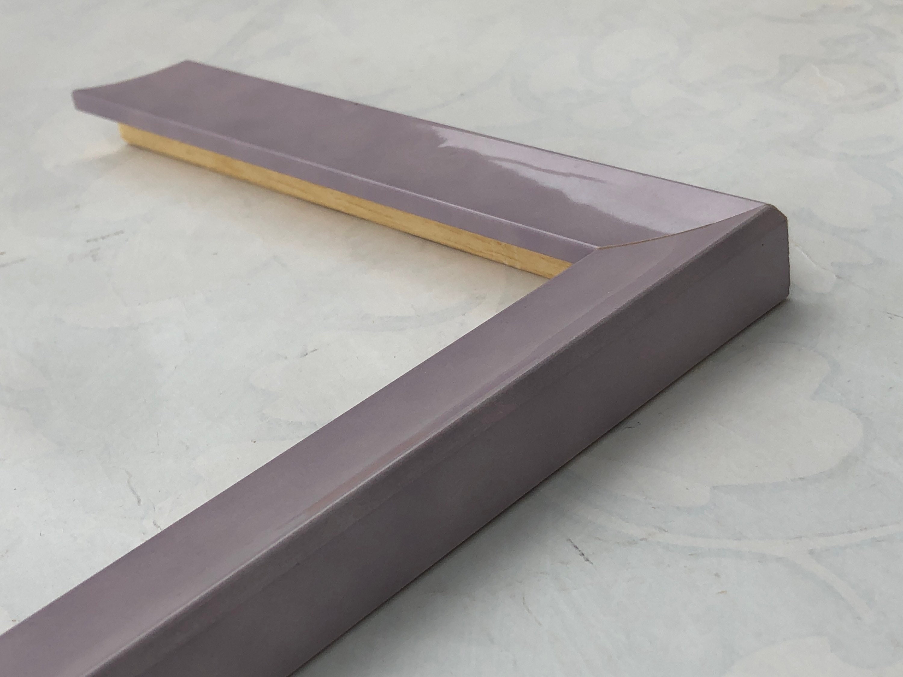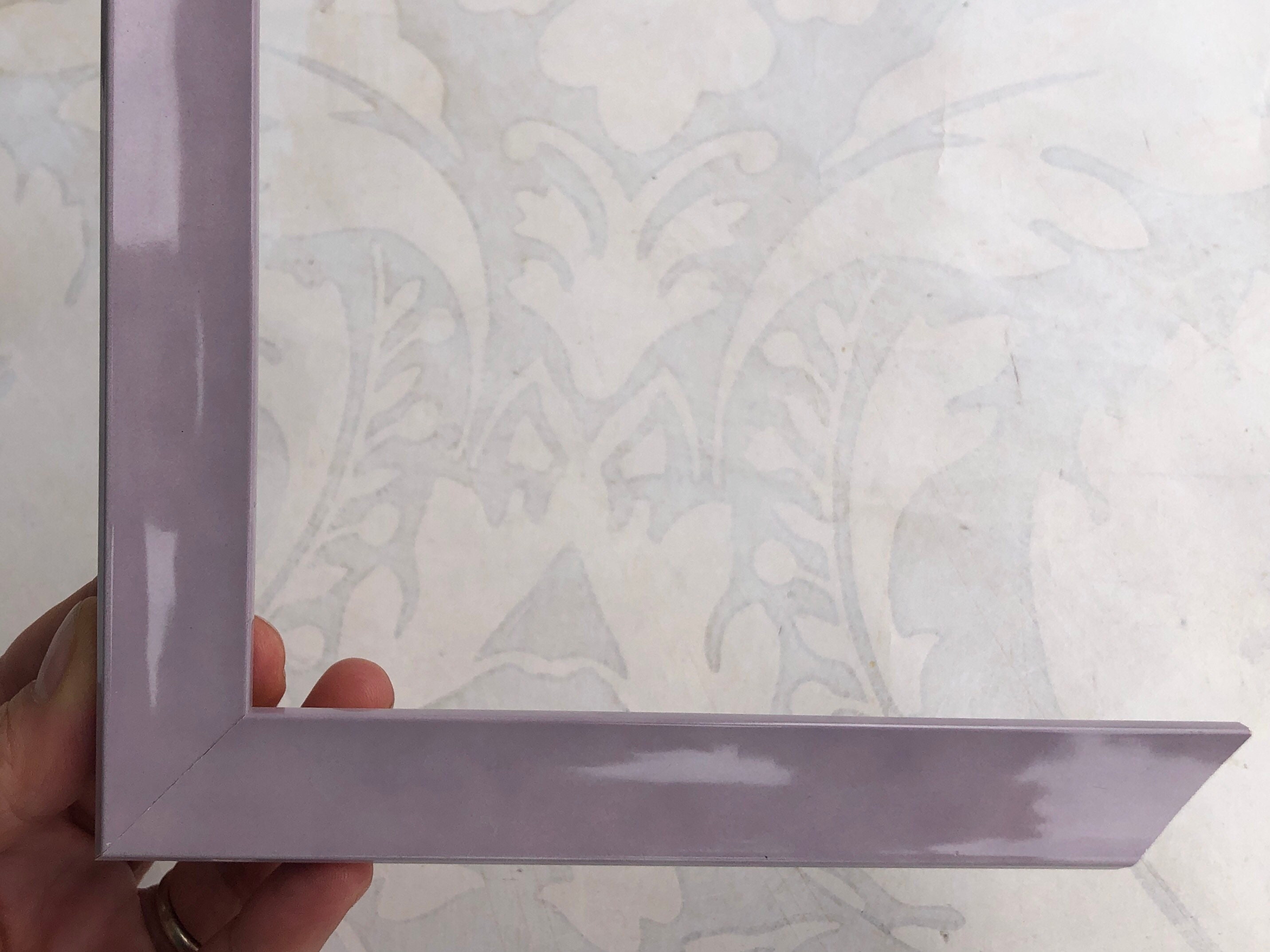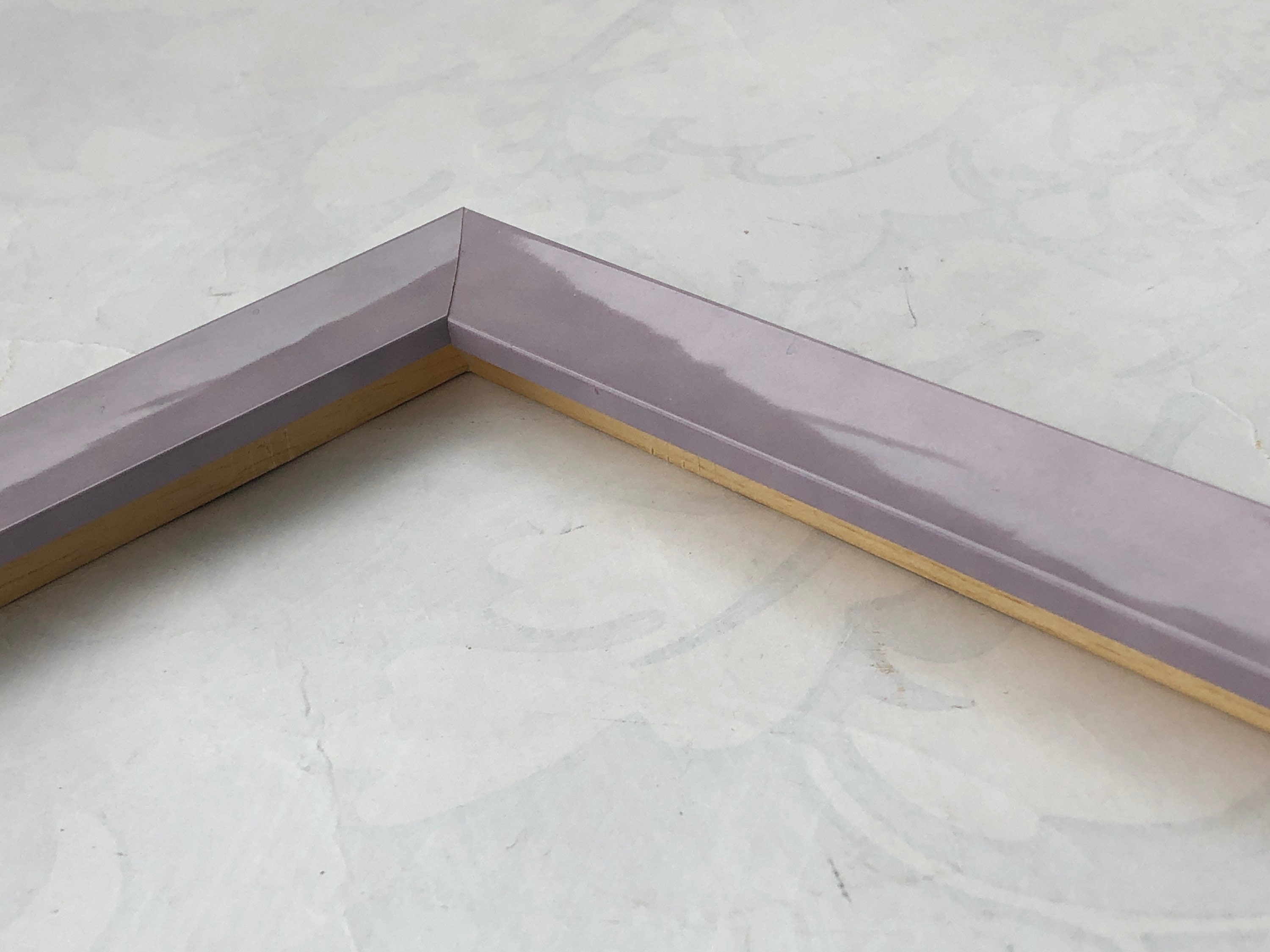 This picture frame is made of a solid hard wood with a highly lacquered lavender purple finish. The shape is an inward scoop drawing your eye to the image.