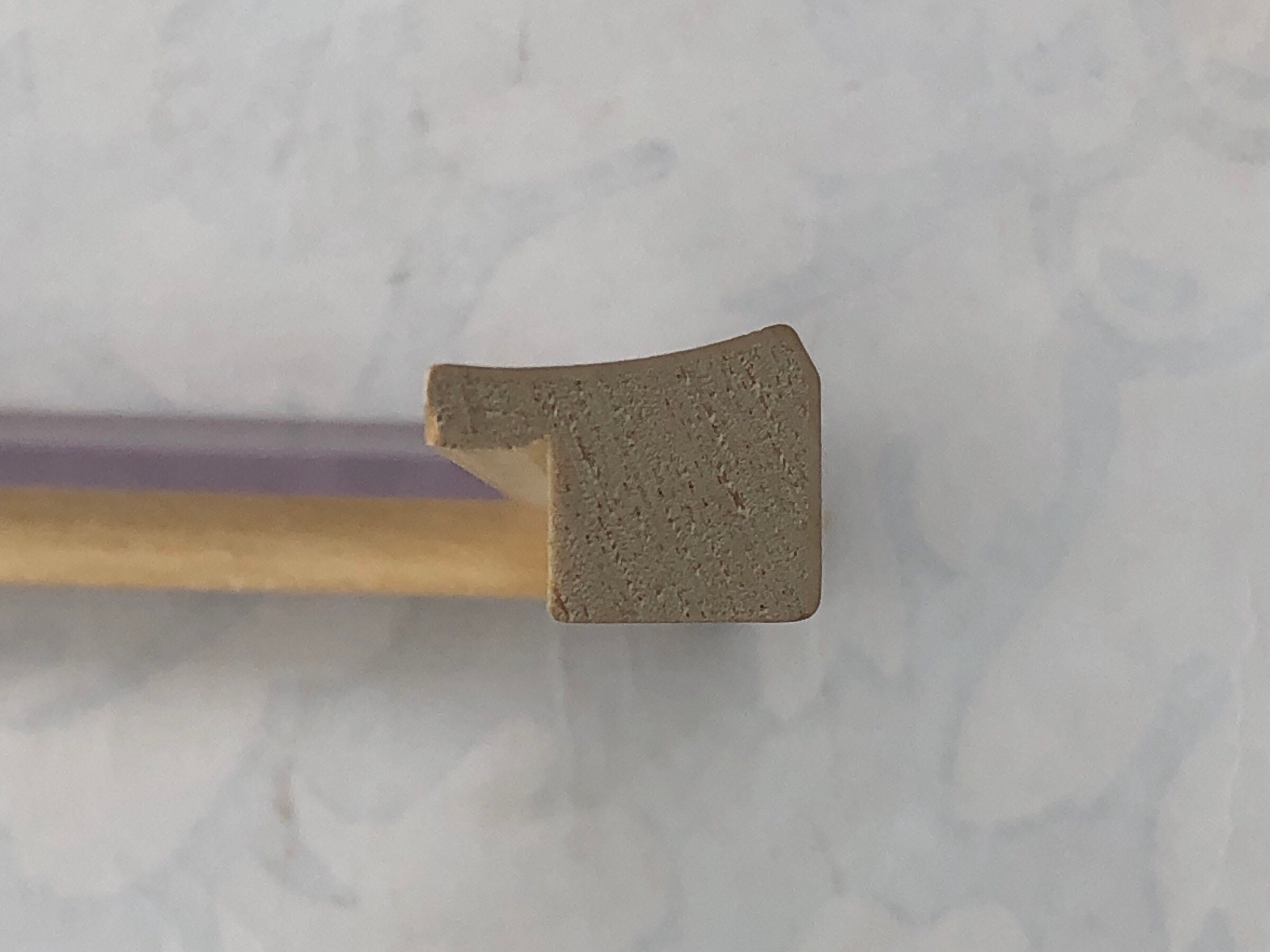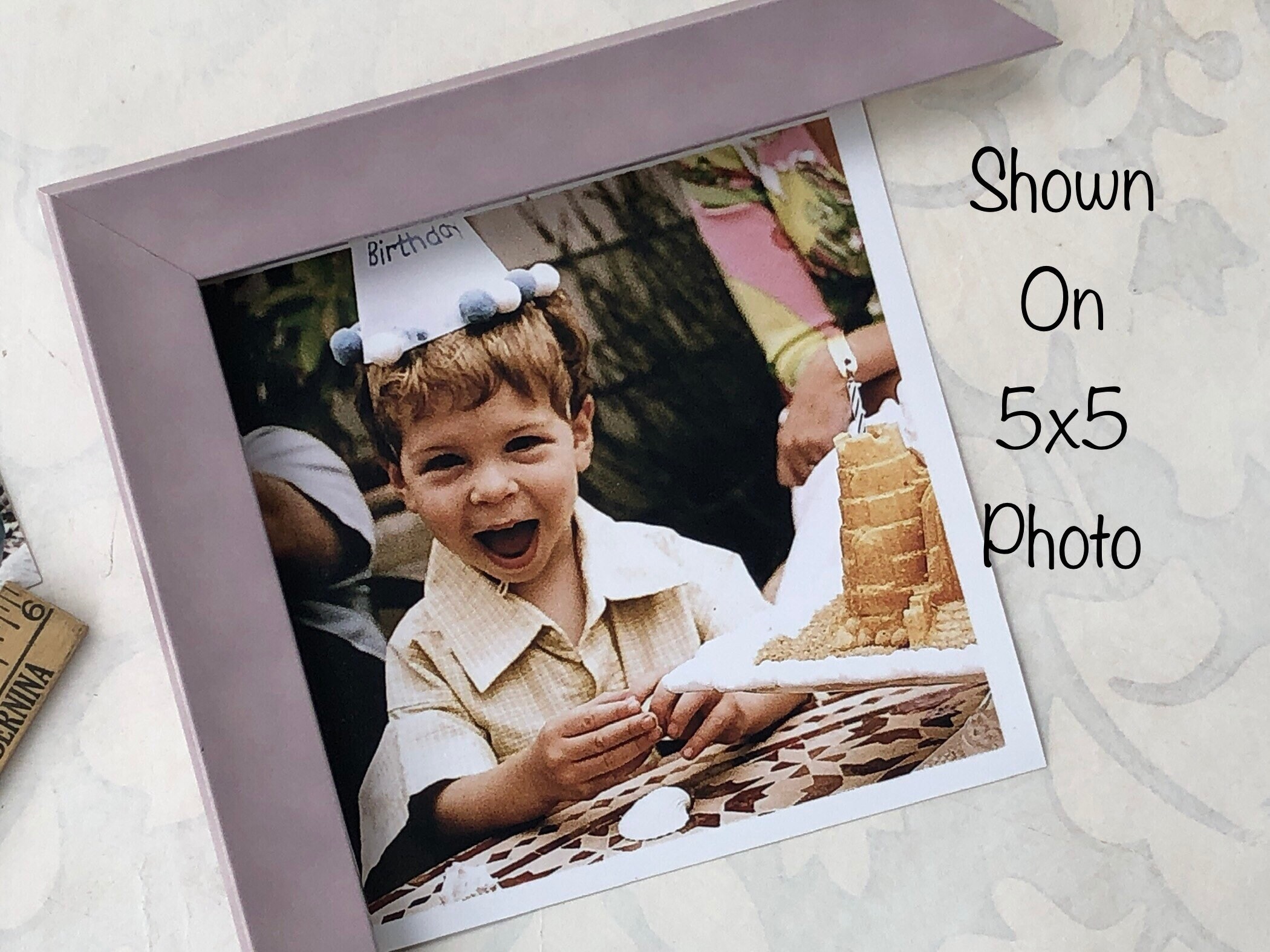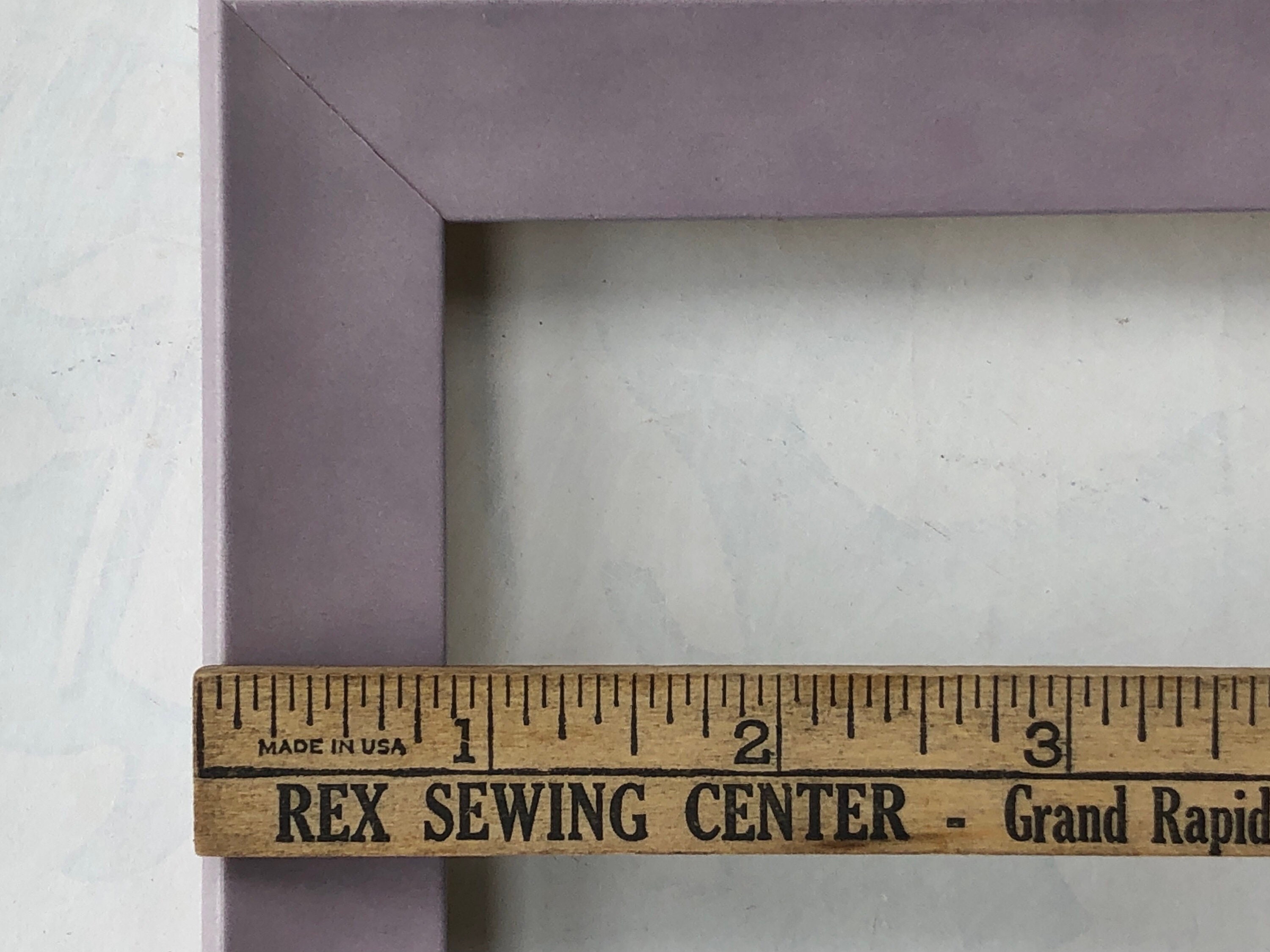 This picture frame is made of a solid hard wood with a highly lacquered lavender purple finish. The shape is an inward scoop drawing your eye to the image.