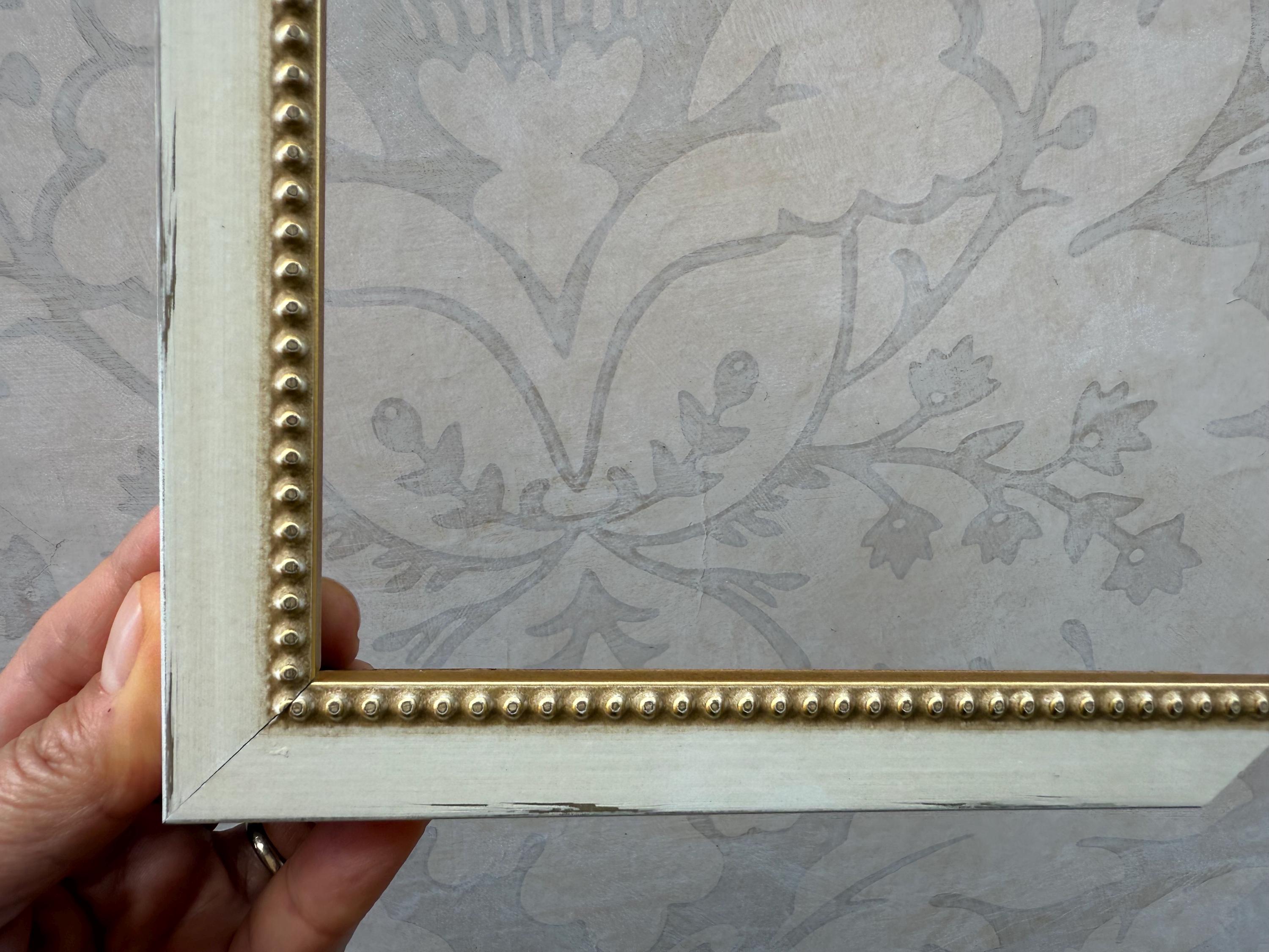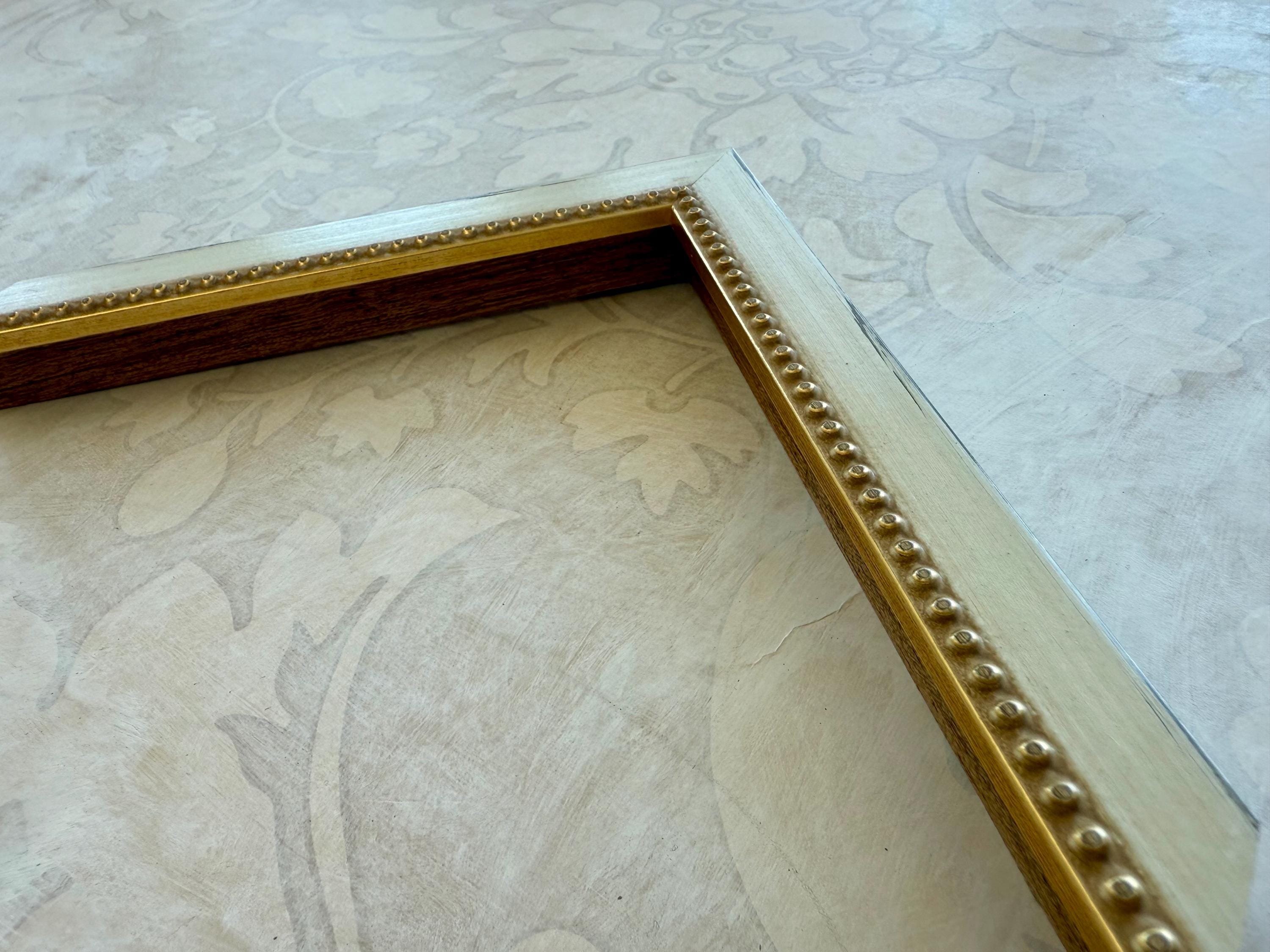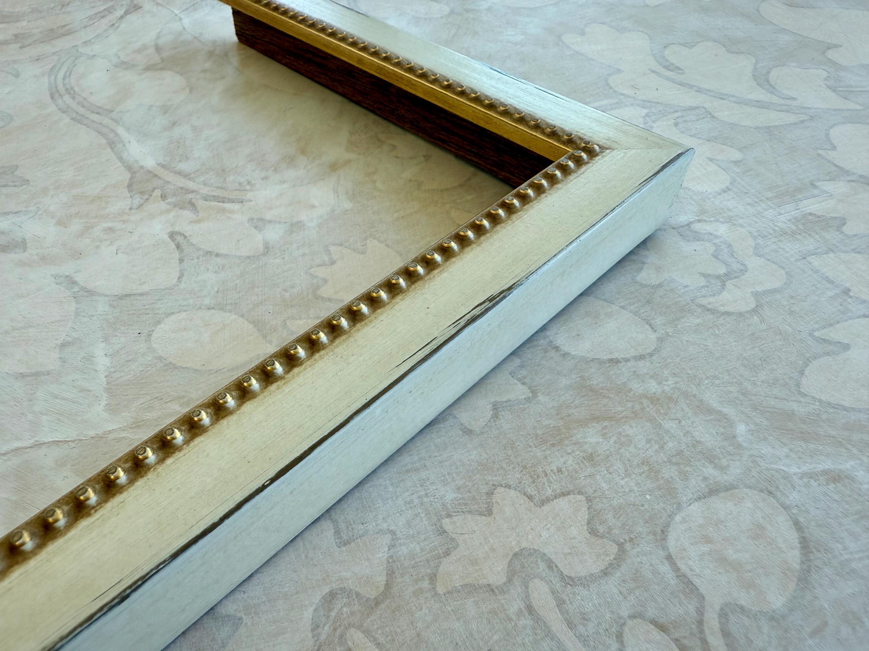 The frame is solid wood with a distressed black finish. These frames have been hand finished, and the degree of distressing will vary. The profile is squared off with a small, raised beading on the inner lip.