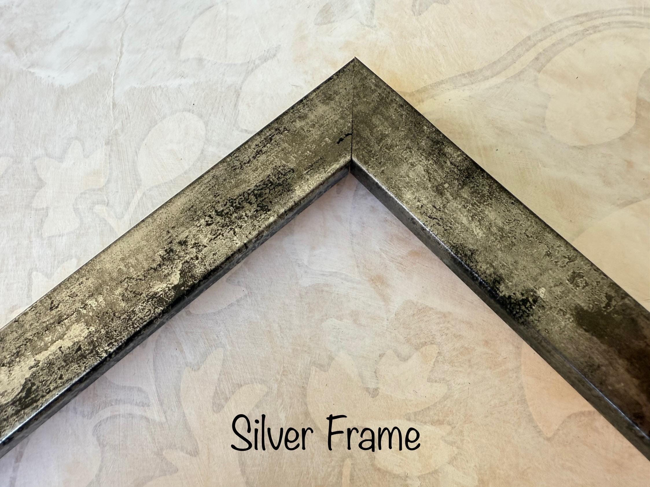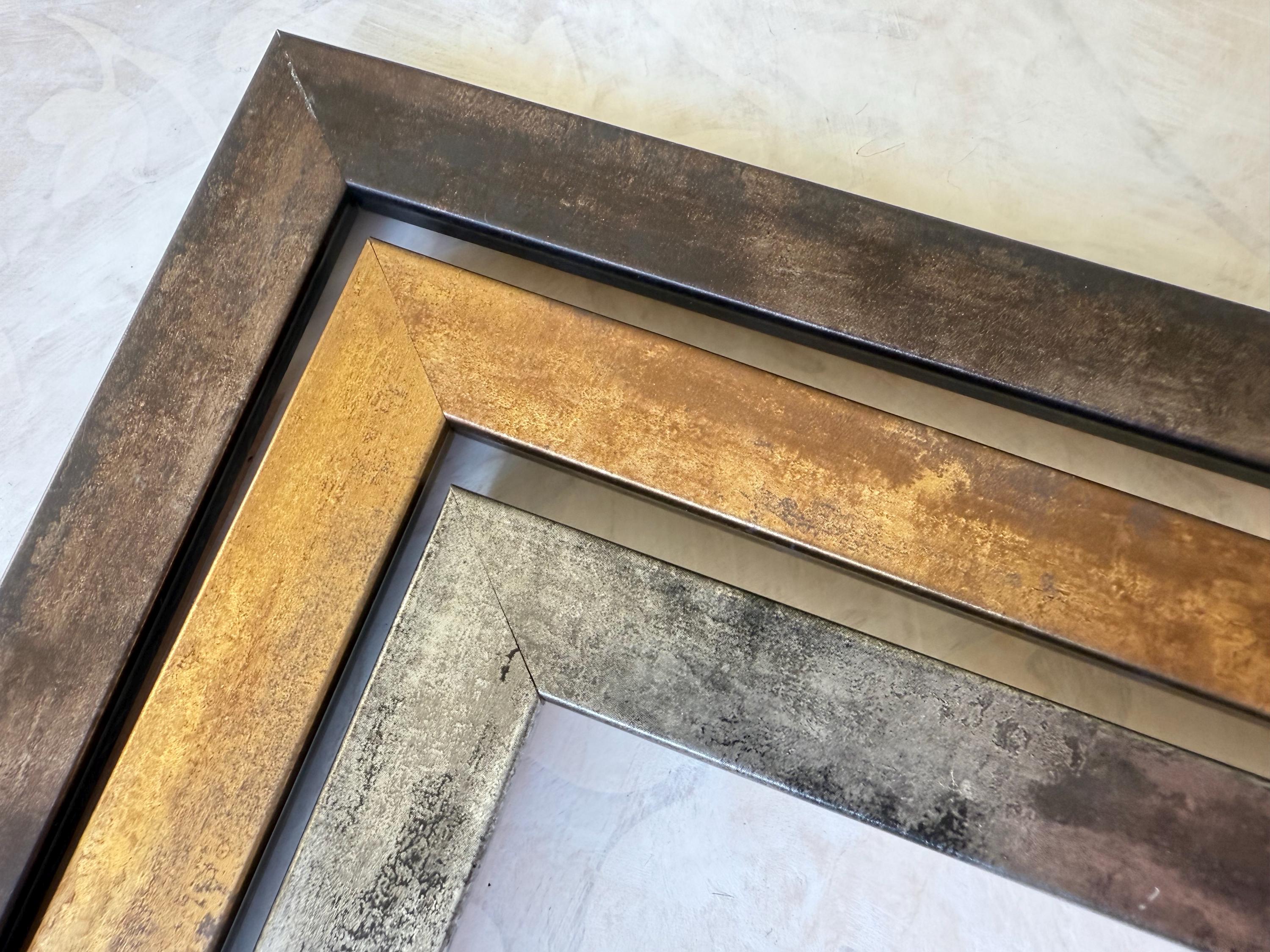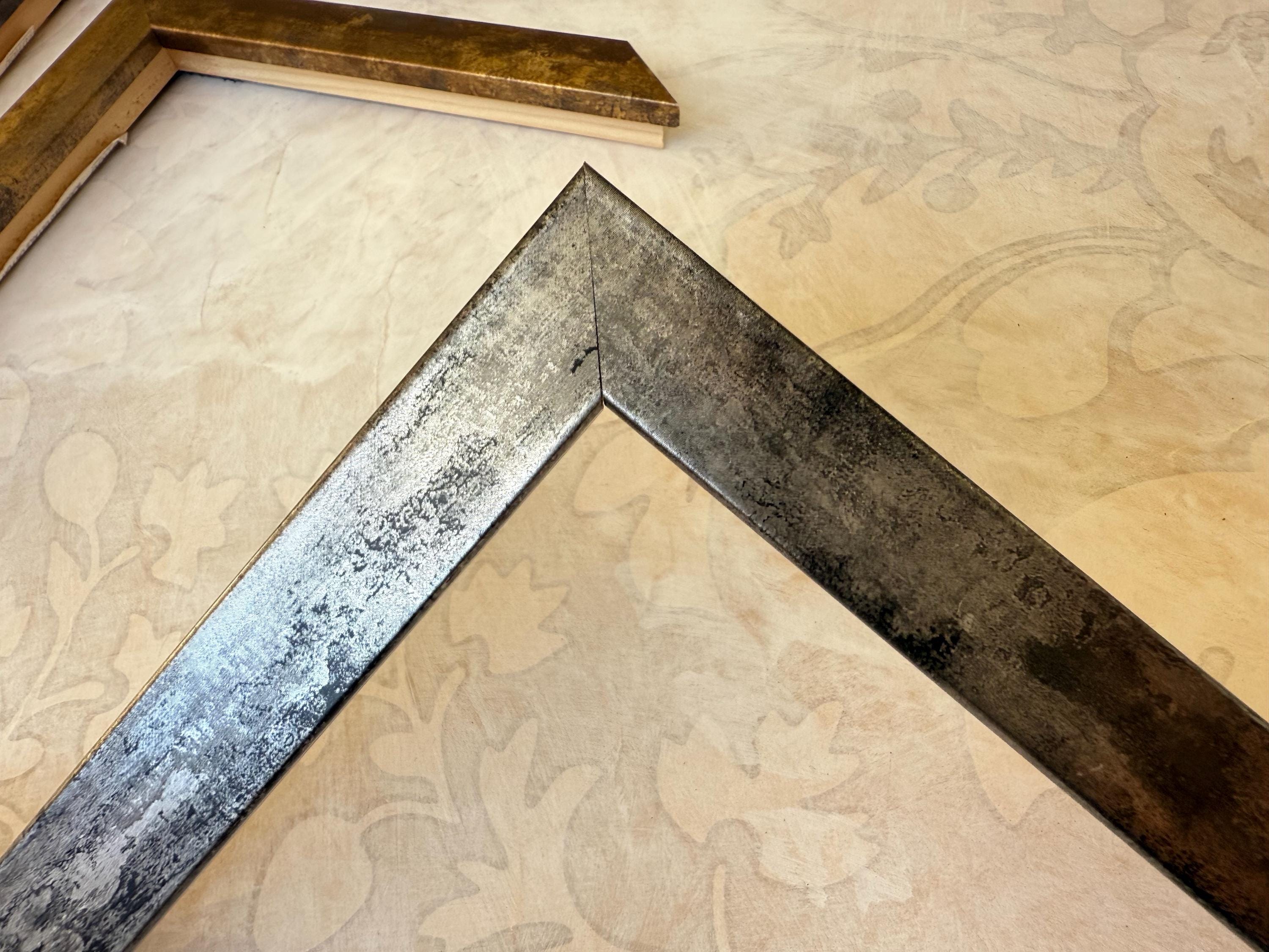 The solid wood frame has a distressed and burnished finish in gold, silver and charcoal.