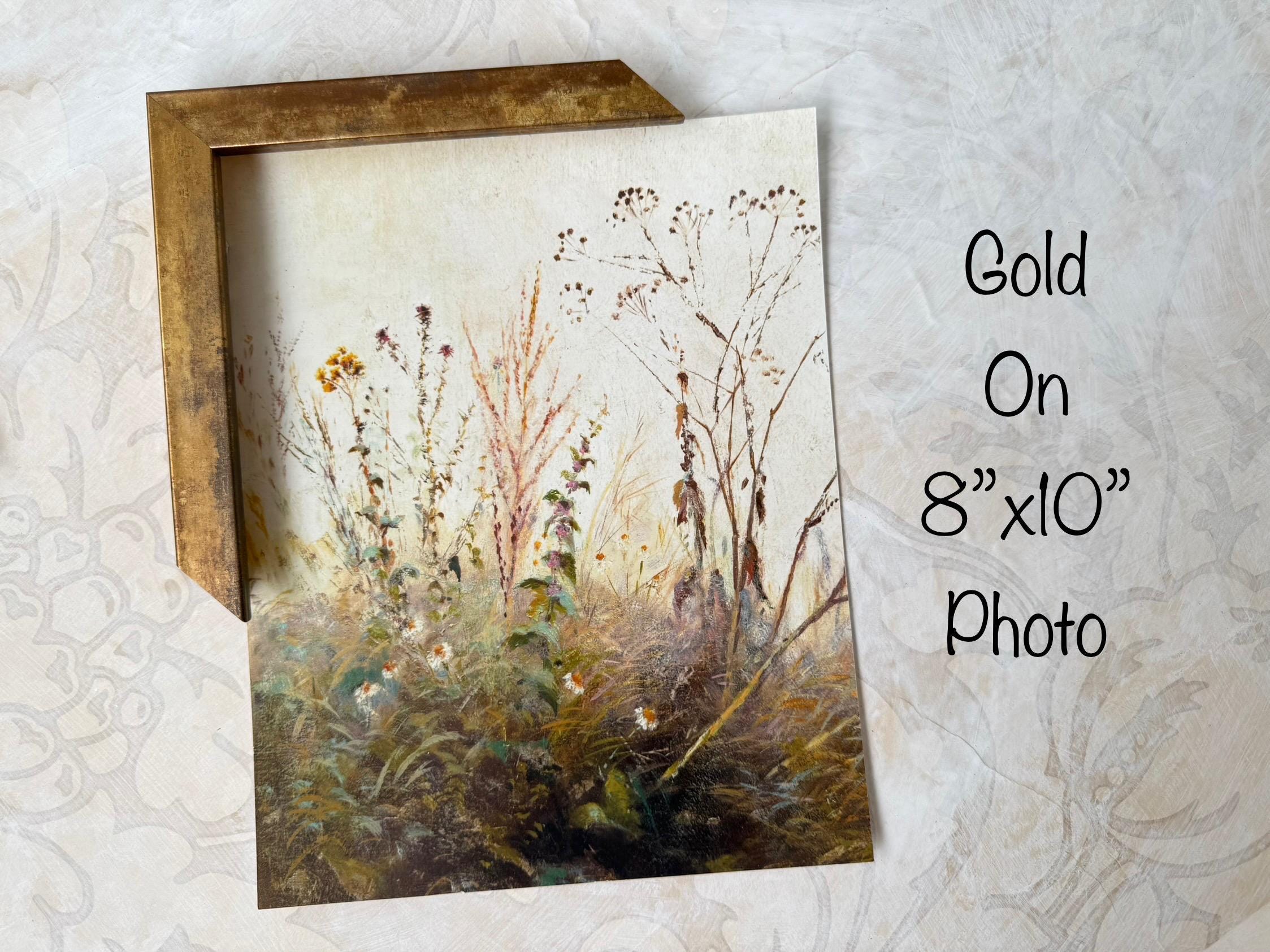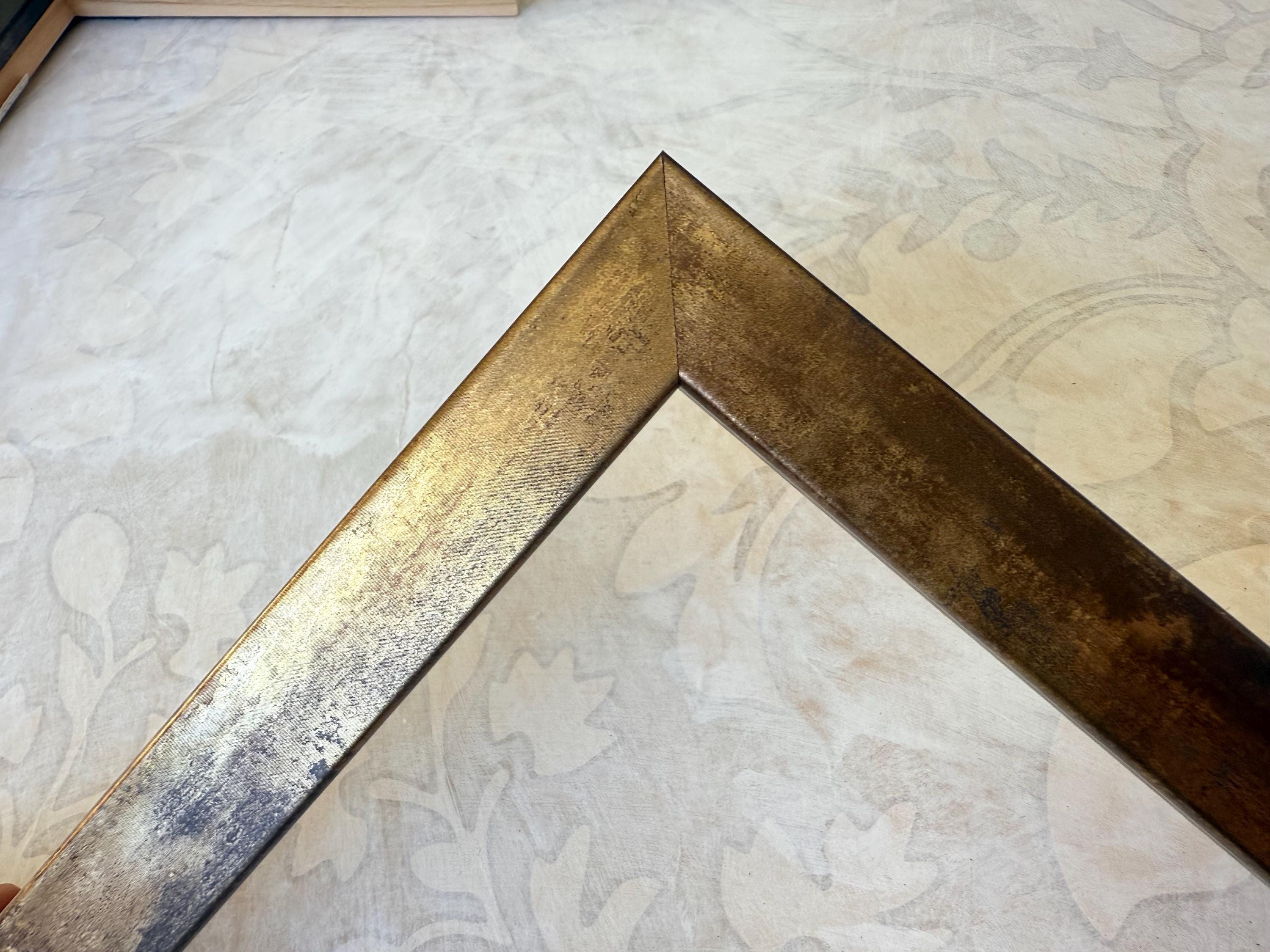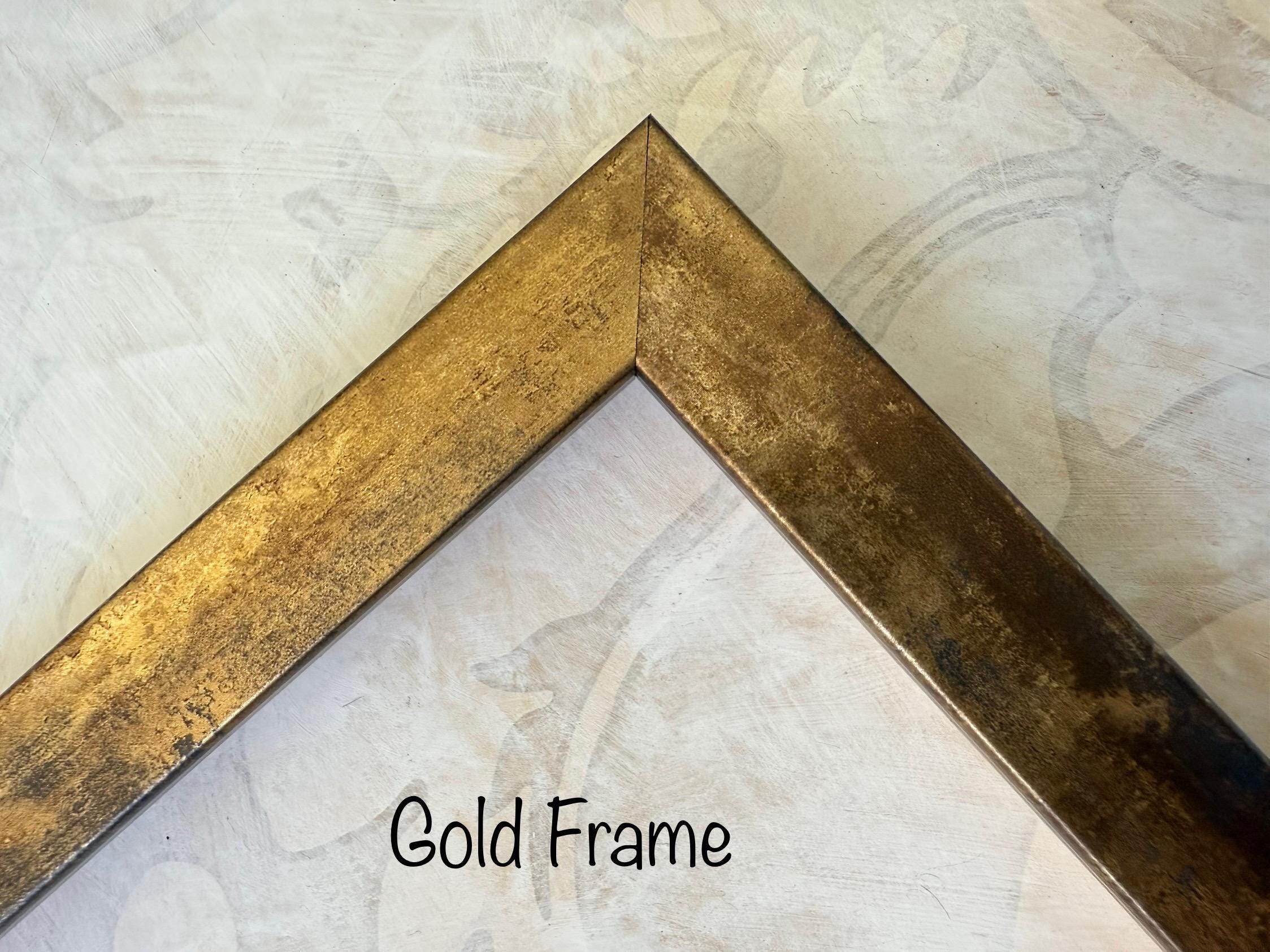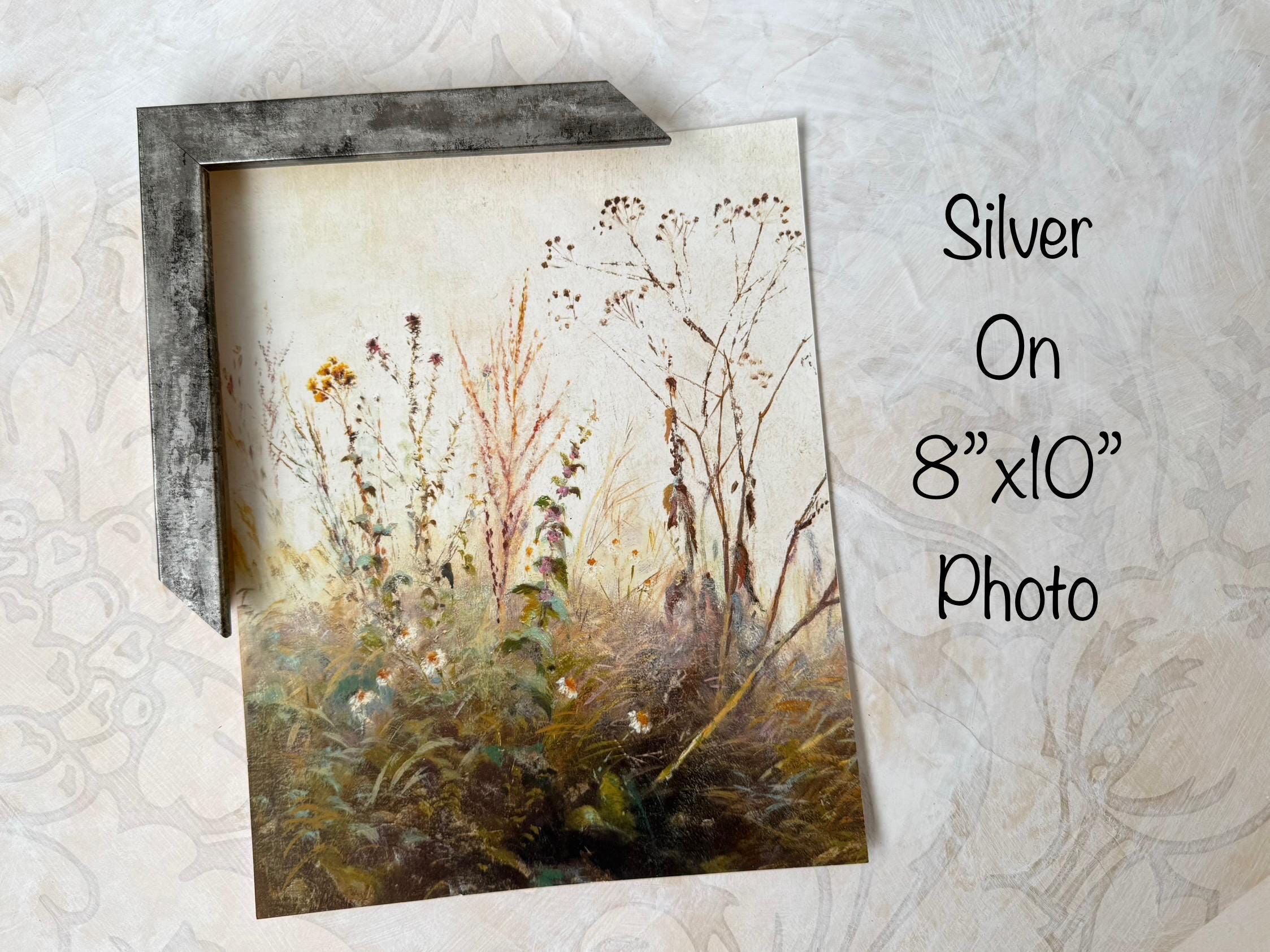 The solid wood frame has a distressed and burnished finish in gold, silver and charcoal.