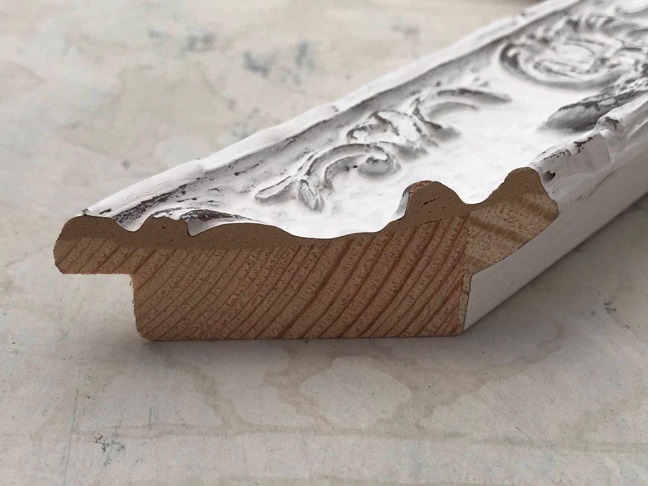 This picture frame has a bright white matte finish rubbed away in places to reveal a warm wood color. It has a traditional carved pattern