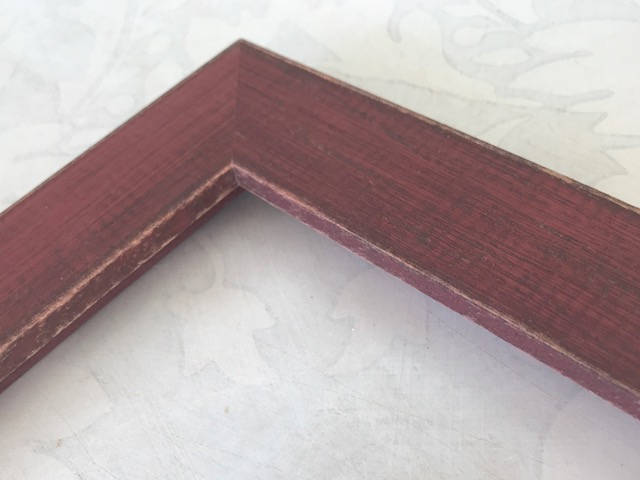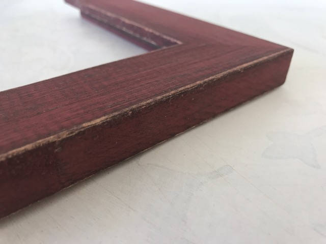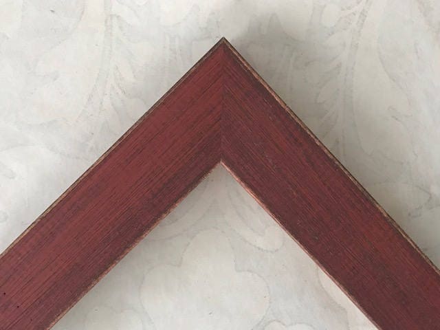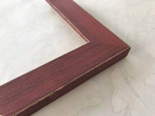 Solid reclaimed wood frame with a deep red stain. Custom cut to any size.