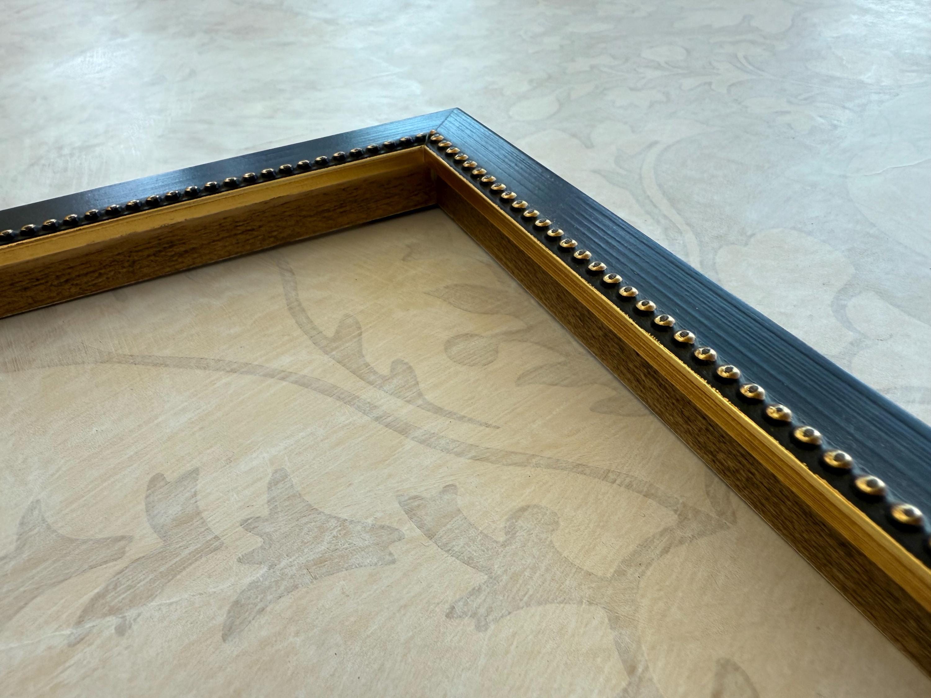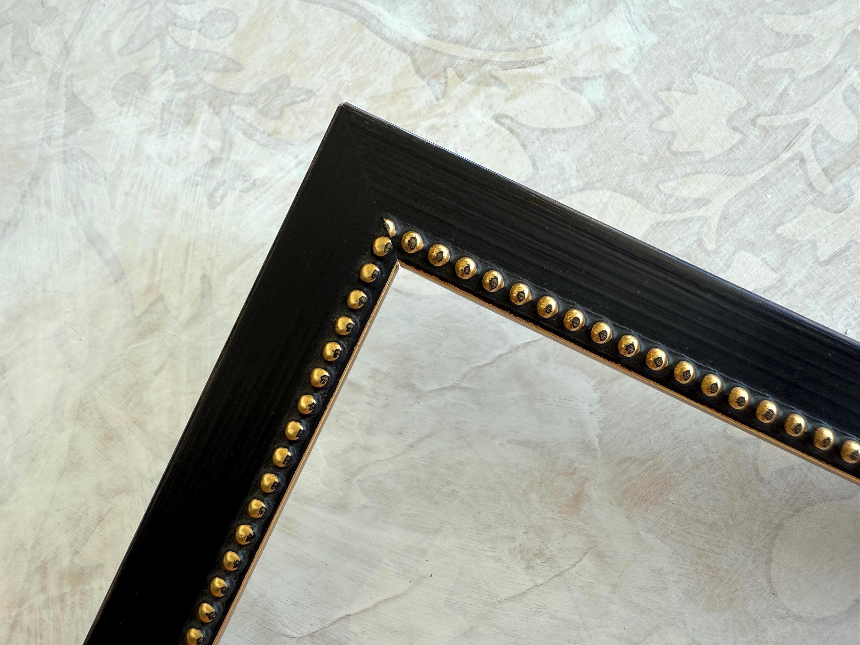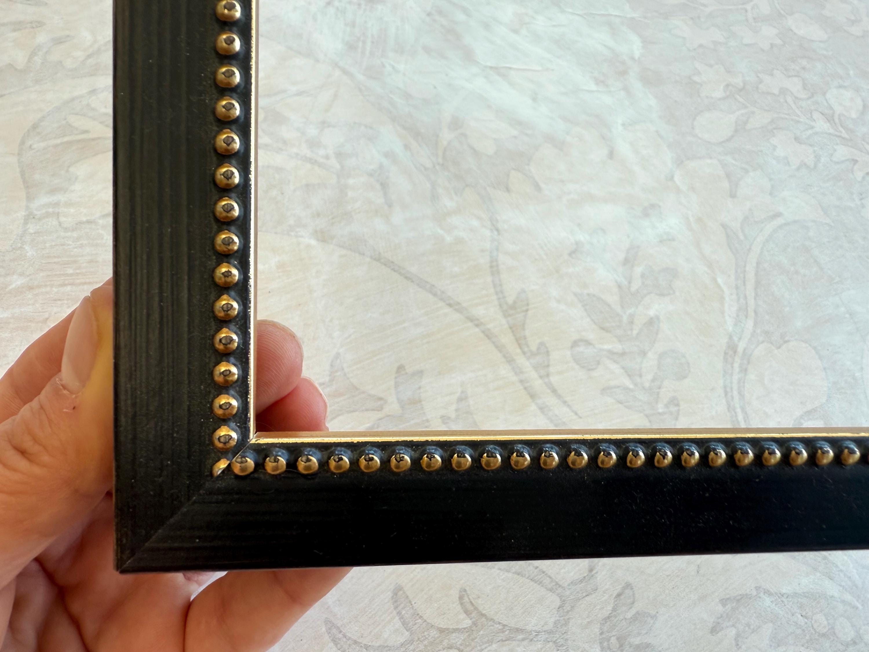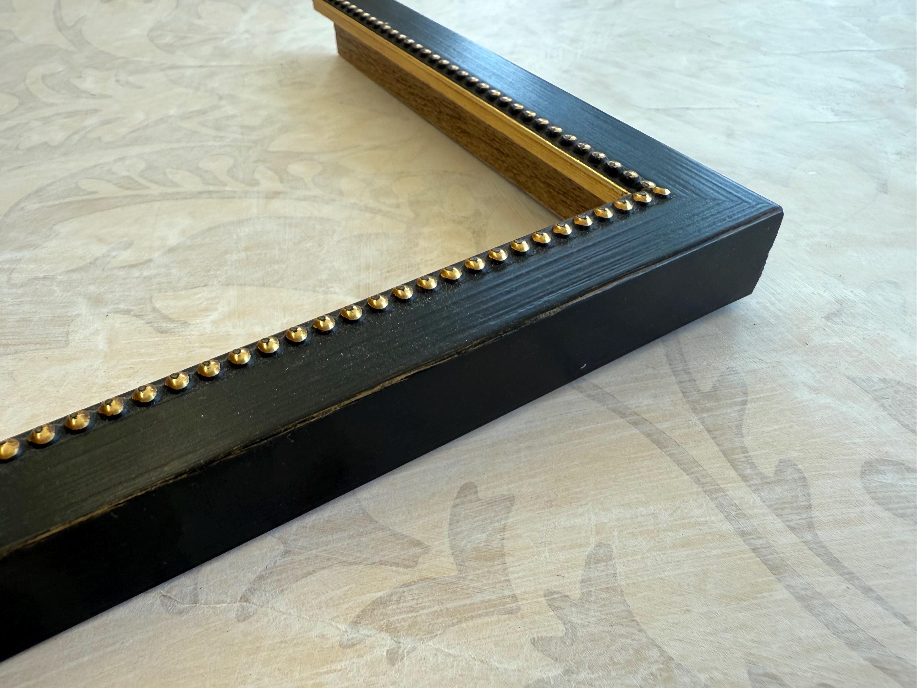 The frame is solid wood with a distressed black finish. These frames have been hand finished and the degree of distressing will vary. The profile is squared off with a small raised beading on the inner lip.